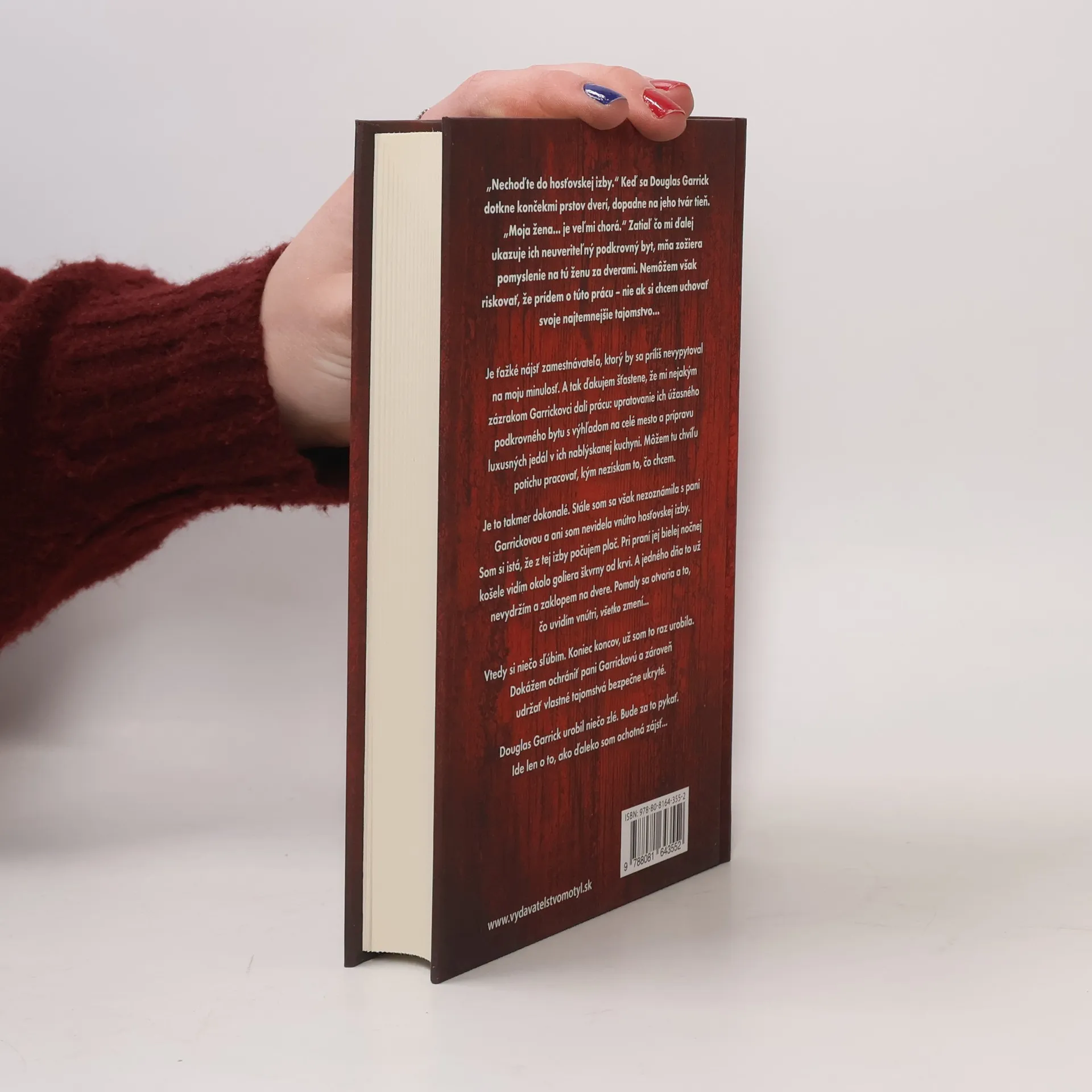 Je ťažké nájsť zamestnávateľa, ktorý by sa príliš nevypytoval na moju minulosť. A tak ďakujem šťastene, že mi nejakým zázrakom Garrickovci dali prácu: upratovanie ich úžasného podkrovného bytu s výhľadom na celé mesto a prípravu luxusných jedál v ich nablýskanej kuchyni. Môžem tu chvíľu potichu pracovať, kým nezískam to, čo chcem. Je to takmer dokonalé. Stále som sa však nezoznámila s pani Garrickovou a ani som nevidela vnútro hosťovskej izby. Som si istá, že z tej izby počujem plač. Pri praní jej bielej nočnej košele vidím okolo goliera škvrny od krvi. A jedného dňa to už nevydržím a zaklopem na dvere. Pomaly sa otvoria a to, čo uvidím vnútri, všetko zmení... Vtedy si niečo sľúbim. Koniec koncov, už som to raz urobila. Dokážem ochrániť pani Garrickovú a zároveň udržať vlastné tajomstvá bezpečne ukryté. Douglas Garrick urobil niečo zlé. Bude za to pykať. Ide len o to, ako ďaleko som ochotná zájsť...