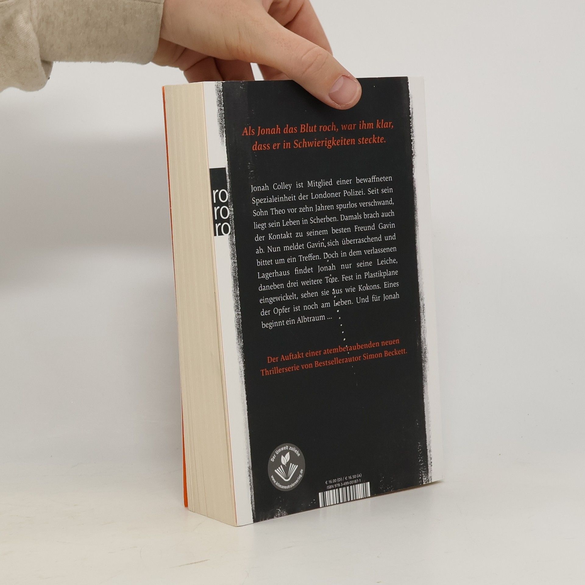 Als Jonah das Blut roch, war ihm klar, dass er in Schwierigkeiten steckte. Jonah Colley ist Mitglied einer bewaffneten Spezialeinheit der Londoner Polizei. Seit sein Sohn Theo vor zehn Jahren spurlos verschwand, liegt sein Leben in Scherben. Damals brach auch der Kontakt zu seinem besten Freund Gavin ab. Nun meldet Gavin sich überraschend und bittet um ein Treffen. Doch in dem verlassenen Lagerhaus findet Jonah nur seine Leiche, daneben drei weitere Tote. Fest in Plastikplane eingewickelt, sehen sie aus wie Kokons. Eines der Opfer ist noch am Leben. Und für Jonah beginnt ein Albtraum … Der Auftakt einer atemberaubenden neuen Thrillerserie von Bestsellerautor Simon Beckett.