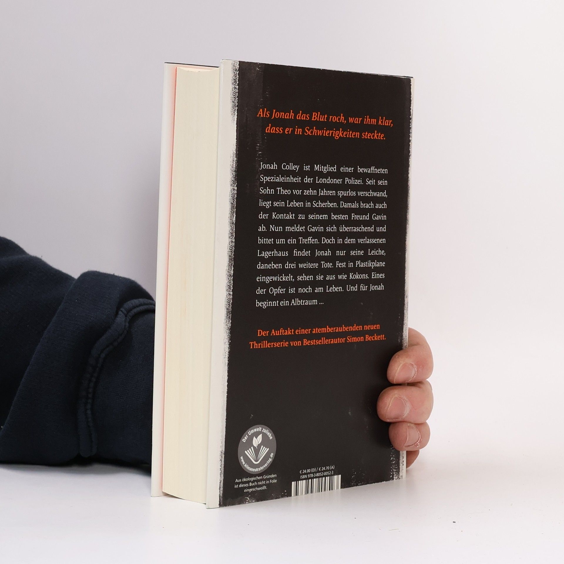 Als Jonah das Blut roch, war ihm klar, dass er in Schwierigkeiten steckte. Jonah Colley ist Mitglied einer bewaffneten Spezialeinheit der Londoner Polizei. Seit sein Sohn Theo vor zehn Jahren spurlos verschwand, liegt sein Leben in Scherben. Damals brach auch der Kontakt zu seinem besten Freund Gavin ab. Nun meldet Gavin sich überraschend und bittet um ein Treffen. Doch in dem verlassenen Lagerhaus findet Jonah nur seine Leiche, daneben drei weitere Tote. Fest in Plastikplane eingewickelt, sehen sie aus wie Kokons. Eines der Opfer ist noch am Leben. Und für Jonah beginnt ein Albtraum… Der Auftakt einer atemberaubenden neuen Thrillerserie von Bestsellerautor Simon Beckett.