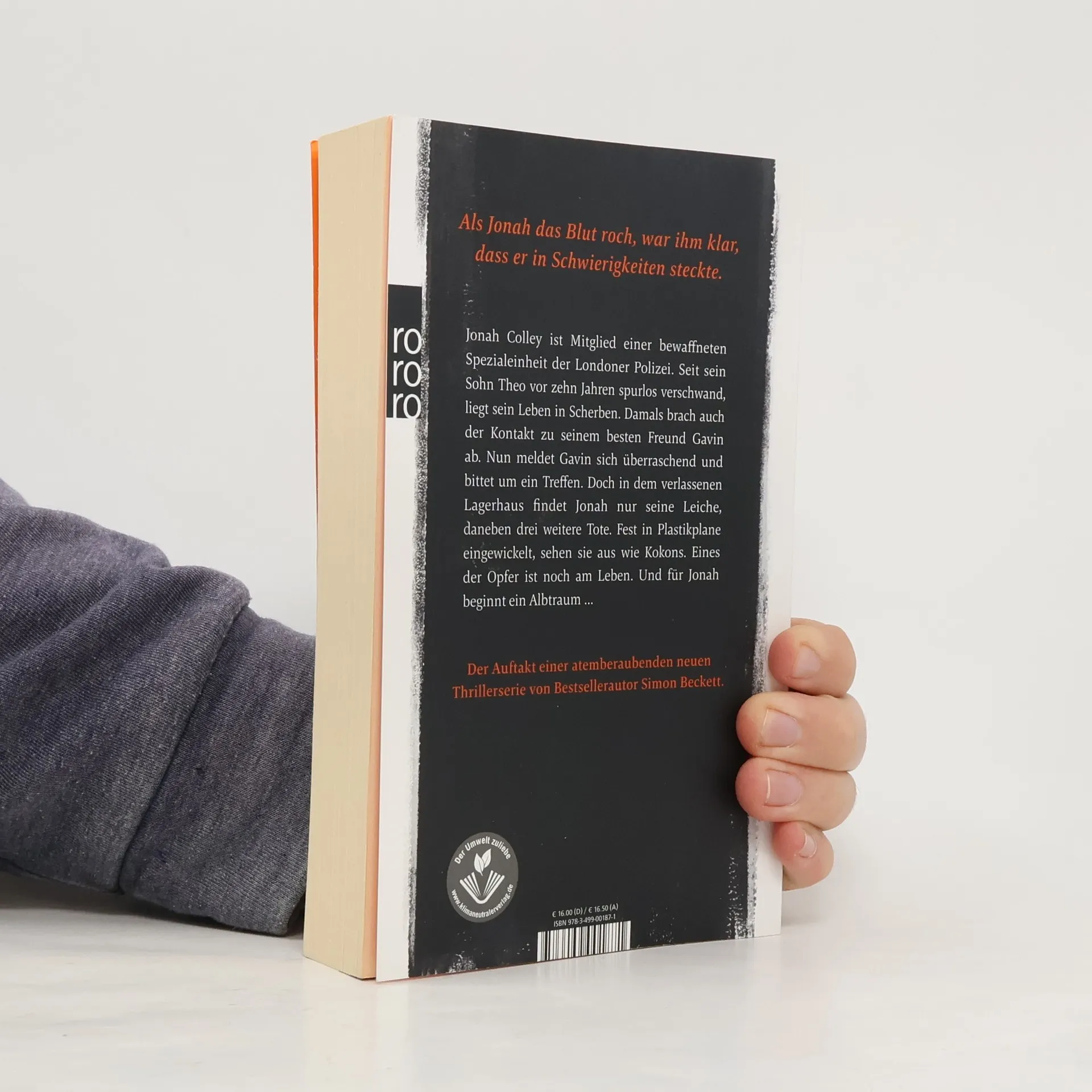 Als Jonah das Blut roch, war ihm klar, dass er in Schwierigkeiten steckte. Jonah Colley ist Mitglied einer bewaffneten Spezialeinheit der Londoner Polizei. Seit sein Sohn Theo vor zehn Jahren spurlos verschwand, liegt sein Leben in Scherben. Damals brach auch der Kontakt zu seinem besten Freund Gavin ab. Nun meldet Gavin sich überraschend und bittet um ein Treffen. Doch in dem verlassenen Lagerhaus findet Jonah nur seine Leiche, daneben drei weitere Tote. Fest in Plastikplane eingewickelt, sehen sie aus wie Kokons. Eines der Opfer ist noch am Leben. Und für Jonah beginnt ein Albtraum … Der Auftakt einer atemberaubenden neuen Thrillerserie von Bestsellerautor Simon Beckett.