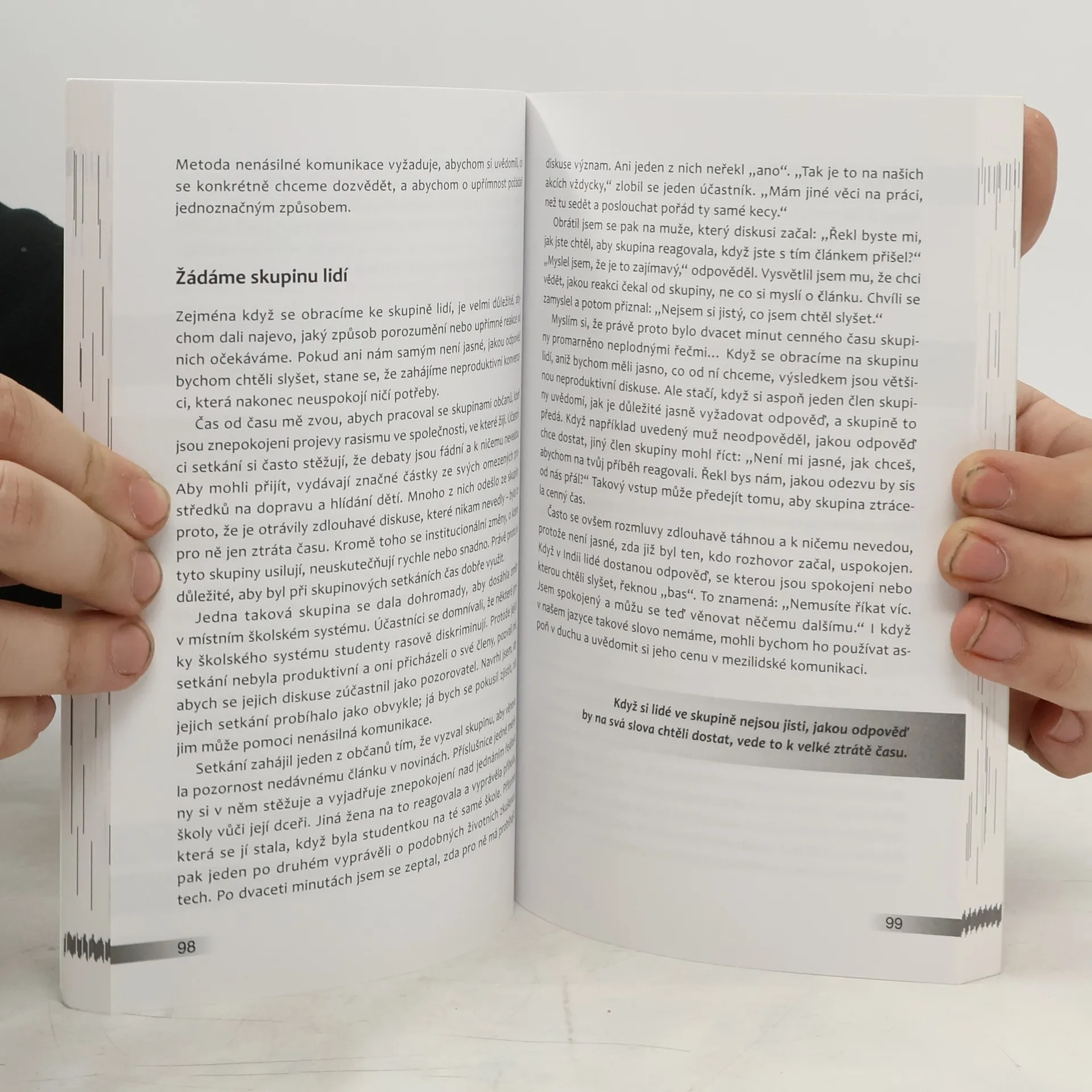 Většina z nás byla vychovávána k posuzování, soutěživosti, ke kladení požadavků a ke komunikaci s lidmi v termínech, co je „správné“ a co „špatné“. Komunikace v tomto smyslu často vede k nedorozuměním. Koncept NVC (Nonviolent Communication) – tedy koncept nenásilné komunikace – který rozvinul M. B. Rosenberg, představuje ucelený výcvik v komunikaci a je založen na naslouchání sobě i partnerovi, ochotě vnímat potřeby a pocity vlastní i druhého. Metoda NVC osvobozuje komunikaci od negativních zkušeností, pomáhá překonávat navyklé vzorce v jednání s druhými, napomáhá k řešení konfliktů a rozvíjí vztahy založené na úctě a kooperaci. Knihu ocení čtenáři se zájmem o témata efektivní komunikace, školitelé v oblasti komunikace, učitelé a vychovatelé. 4. vydání