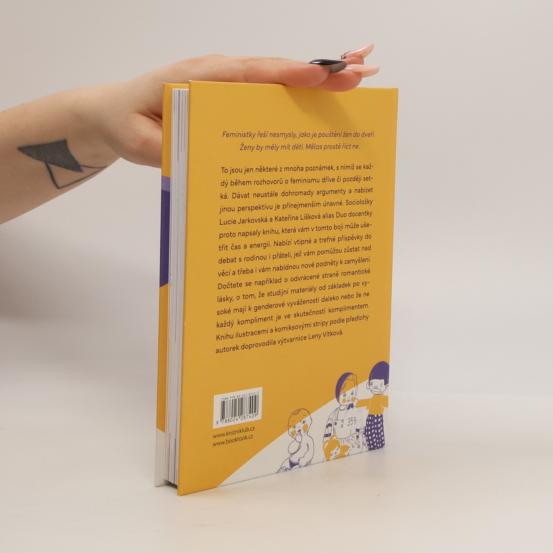 Feministky řeší nesmysly jako je pouštění žen do dveří. Ženy by měly mít děti. Mělas prostě říct ne. To jsou jen některé z mnoha poznámek, s nimiž se každý během rozhovorů o feminismu dříve či později setká. Dávat neustále dohromady argumenty a nabízet jinou perspektivu je přinejmenším únavné. Socioložky Lucie Jarkovská a Kateřina Lišková alias Duo docentky proto napsaly knihu, která vám v tomto boji může ušetřit čas a energii. Nabízí vtipné a trefné příspěvky do debat s rodinou i přáteli, jež vám pomůžou zůstat nad věcí a třeba i vám nabídnou nové podněty k zamyšlení. Dočtete se například o odvrácené straně romantické lásky, o tom, že studijní materiály od základek po vysoké mají k genderové vyváženosti daleko nebo že ne každý kompliment je ve skutečnosti komplimentem. Knihu ilustracemi a komiksovými stripy podle předlohy autorek doprovodila výtvarnice Leny Vítková.