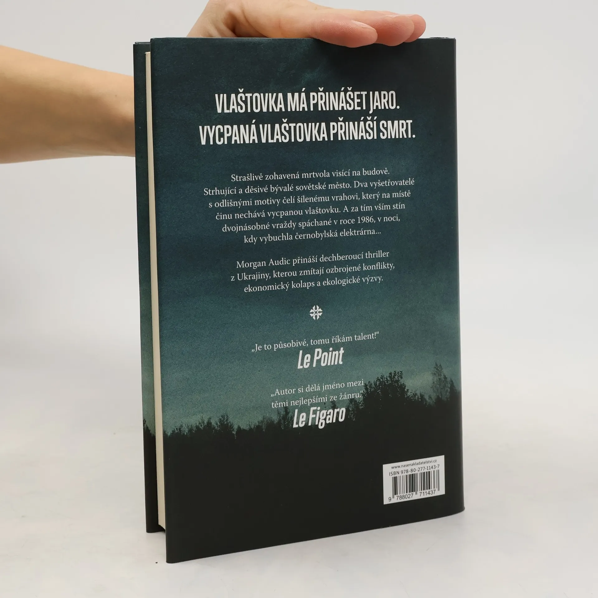 Zvrácený způsob zavraždění jistého Leonida Sokolova, jehož mrtvola je vyvěšena jako prapor na fasádě vysoké budovy, upoutá čtenářovu pozornost v samém úvodu románu. Okamžitě je vtažen do napínavého pátrání po vrahovi, jenž jako podpis zanechává na místě činu vycpanou vlaštovku. Bez pilulky jódu i nezbytné dekontaminace se ocitá přímo na místě havárie z roku 1986, v Černobylu. Ještě je tu ve vzduchu cítit hrozba neviditelného, vzpomínka na apokalypsu a úsek našich dějin, na jehož půdu tento literární žánr dosud nevstoupil.Audic ve svém druhém detektivním románu mistrně vystavěl poutavý příběh, který se odehrává v dnešní době, ale ohlíží se do třicet let vzdálené minulosti. Kapitán Josef Melnyk za ukrajinskou policii a ruský míšenec Rybalko jako soukromý detektiv paralelně vyšetřují zločin v městě Pripjať, někdejší výkladní skříni Sovětského svazu. Právě éra komunismu je v příběhu stále pevně prorostlá do současné Ukrajiny, poznamenané geopolitickými konflikty, hospodářskou krizí a společenským i národním přerodem.