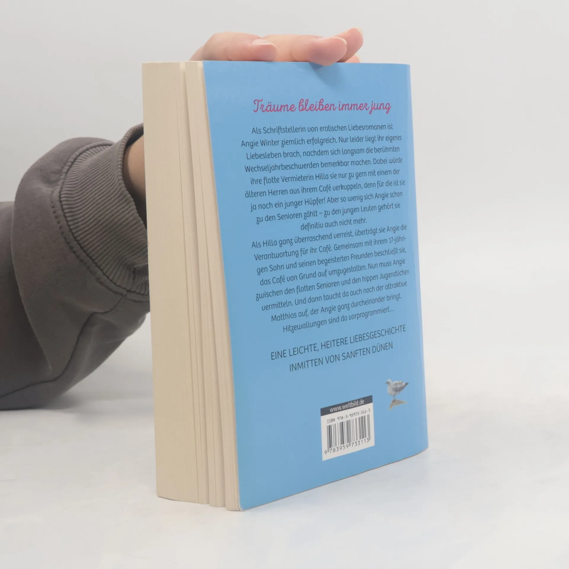 Träume bleiben immer jung Als Schriftstellerin von erotischen Liebesromanen ist Angie Winter ziemlich erfolgreich. Nur leider liegt ihr eigenes Liebesleben brach, nachdem sich langsam die berühmten Wechseljahrbeschwerden bemerkbar machen. Dabei würde ihre flotte Vermieterin Hilla sie nur zu gern mit einem der älteren Herren aus ihrem Café verkuppeln, denn für die ist sie ja noch ein junger Hüpfer! Aber so wenig sich Angie schon zu den Senioren zählt - zu den jungen Leuten gehört sie definitiv auch nicht mehr. Als Hilla ganz überraschend verreist, überträgt sie Angie die Verantwortung für ihr Café. Gemeinsam mit ihrem 17-jährigen Sohn und seinen begeisterten Freunden beschließt sie, das Café von Grund auf umzugestalten. Nun muss Angie zwischen den flotten Senioren und den hippen Jugendlichen vermitteln. Und dann taucht da auch noch der attraktive Matthias auf, der Angie ganz durcheinander bringt. Hitzewallungen sind da vorprogrammiert... Eine leichte, heitere Liebesgeschichte inmitten von sanften Dünen