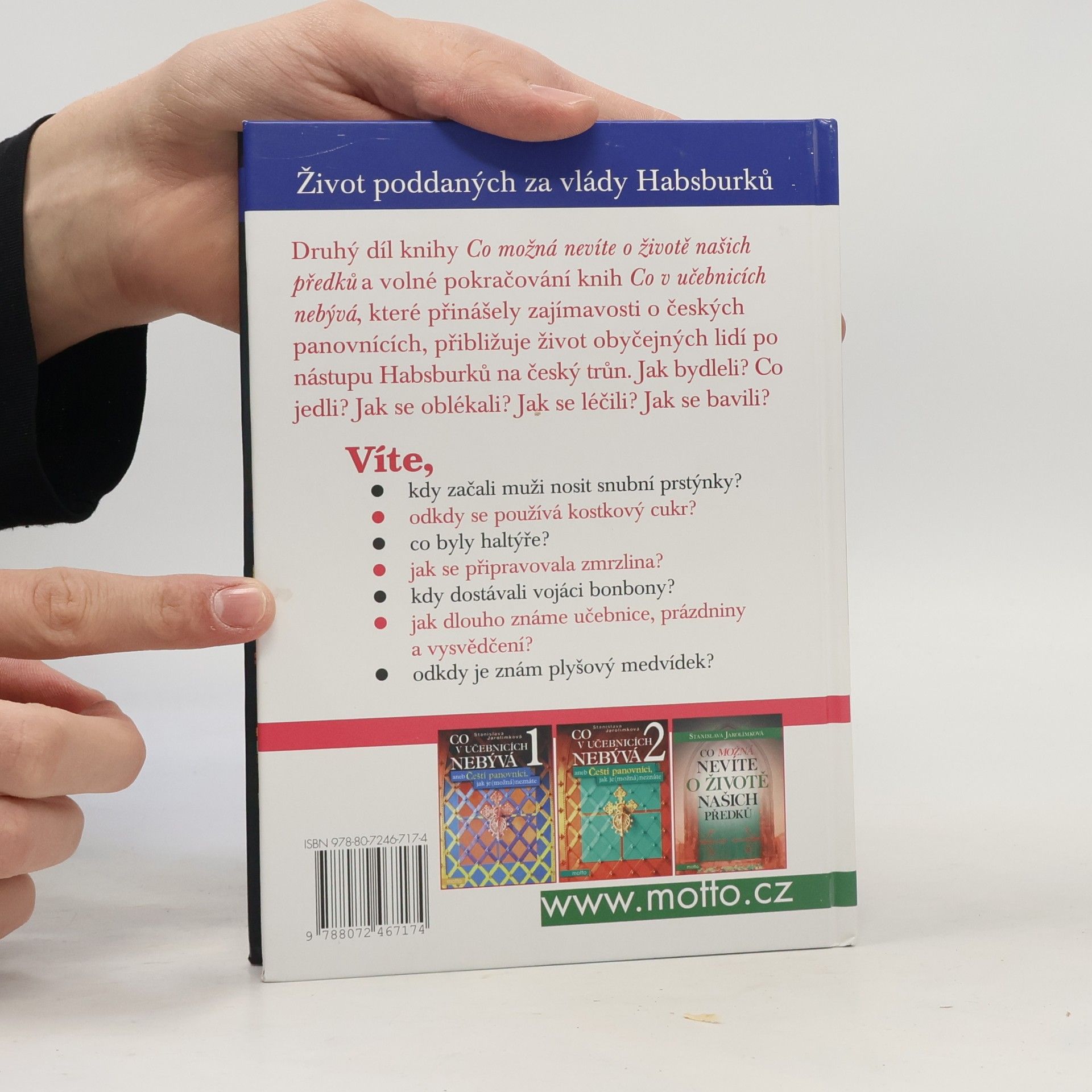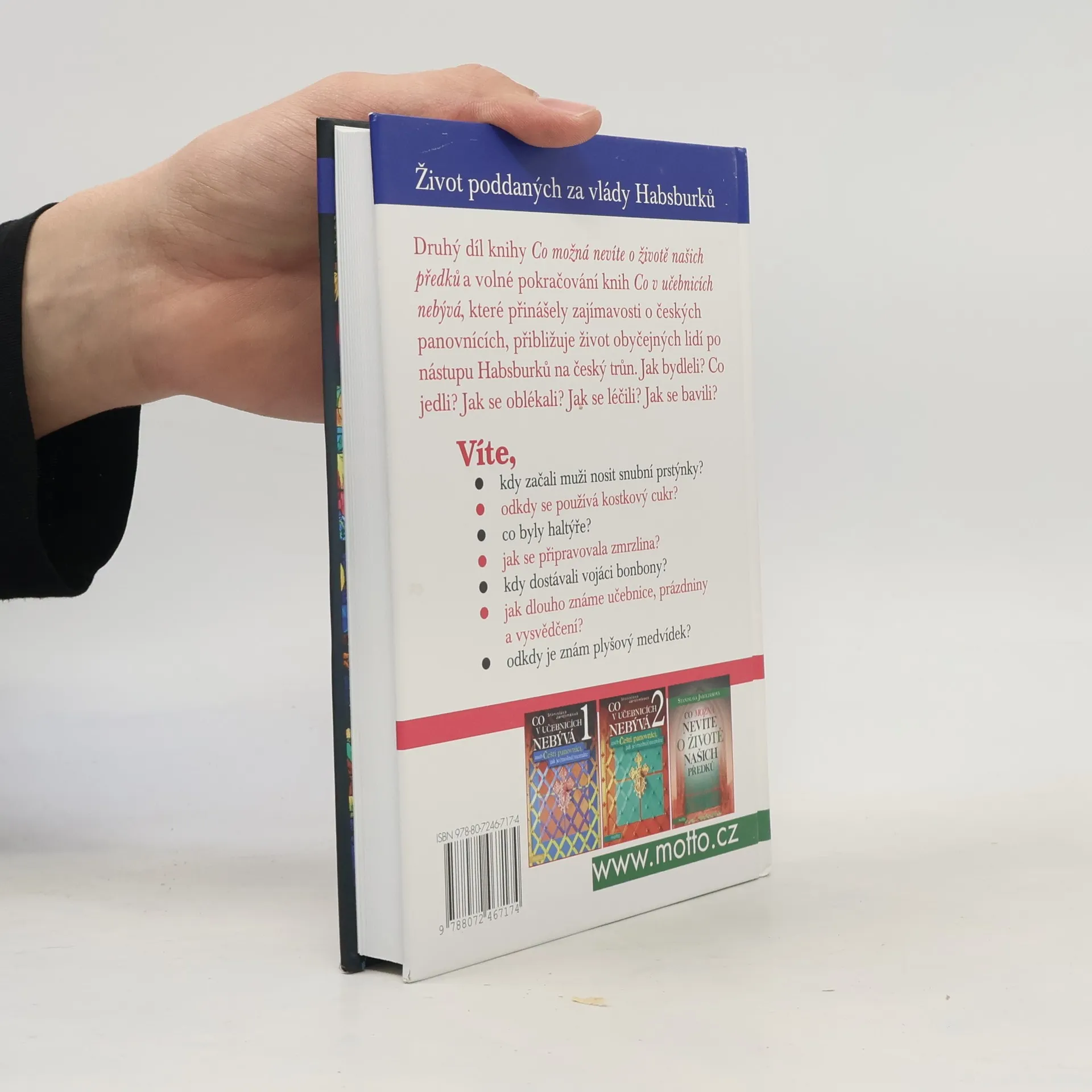 Druhý díl knihy Co možná nevíte o životě našich předků a volné pokračování knih Co v učebnicích nebývá, které přinášely zajímavosti o českých panovnících, přibližuje život obyčejných lidí po nástupu Habsburků na český trůn. Jak bydleli? Co jedli? Jak se oblékali? Jak se léčili? Jak se bavili?