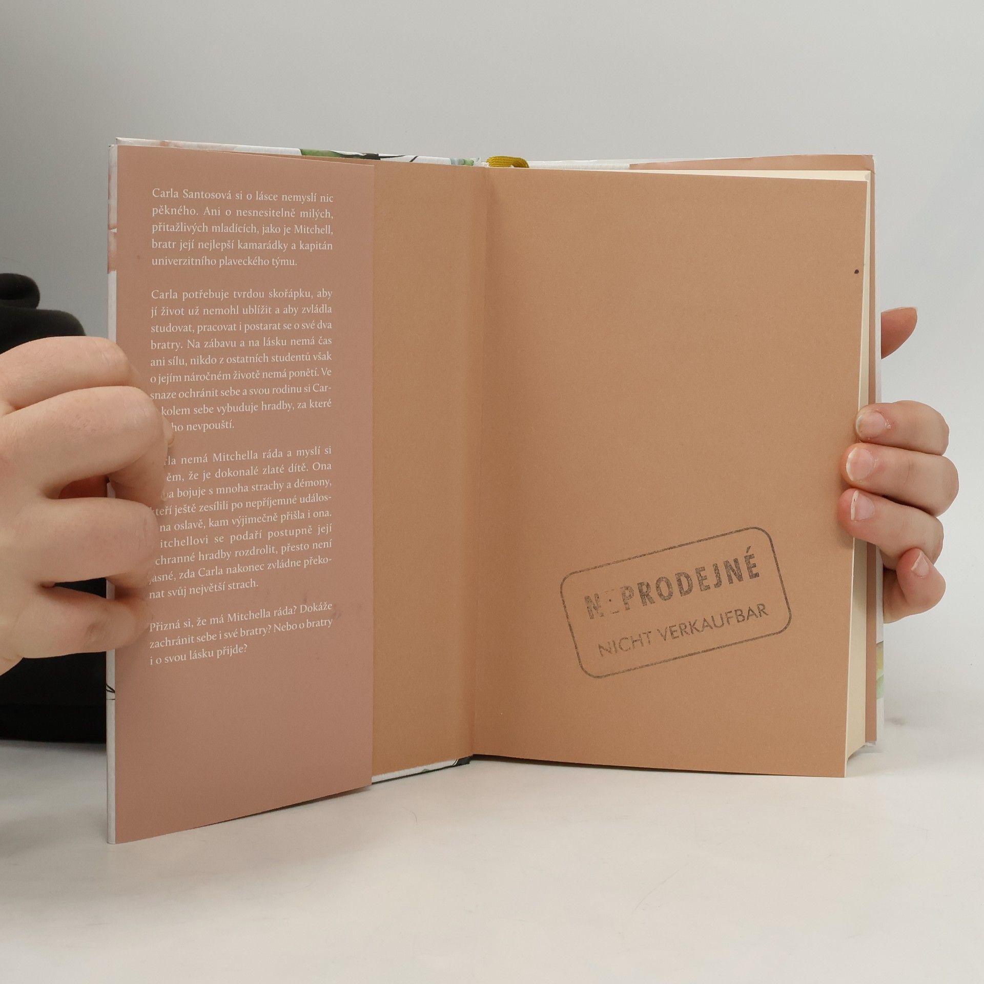 Ona se zamilovat nechce, on už dávno zamilovaný je…Carla Santosová si o lásce nemyslí nic pěkného. Ani o nesnesitelně milých, přitažlivých mladících jako je Mitchell, bratr její nejlepší kamarádky a kapitán univerzitního plaveckého týmu.Carla potřebuje tvrdou skořápku, aby jí život už nemohl ublížit a aby zvládla studovat, pracovat i postarat se o své dva bratry. Na zábavu a na lásku nemá čas ani sílu, nikdo z ostatních studentů však o jejím náročném životě nemá ponětí. Dokonce ani nejbližší kamarádky, s jedinou výjimkou, a tou je její spolubydlící Lenny.Mitchella Carla nemá ráda, protože si myslí, že je to dokonalé zlaté dítě. Ona sama bojuje s mnoha strachy a démony, kteří se probudili po nepříjemné události na jedné oslavě, kam výjimečně přišla i ona. Mitchellovi se podaří postupně Carliny ochranné hradby rozdrolit, přesto není jasné, zda Carla nakonec zvládne překonat svůj největší strach.Přizná si, že má Mitchella ráda? Dokáže zachránit sebe i své bratry? Nebo o bratry i o svou lásku přijde?