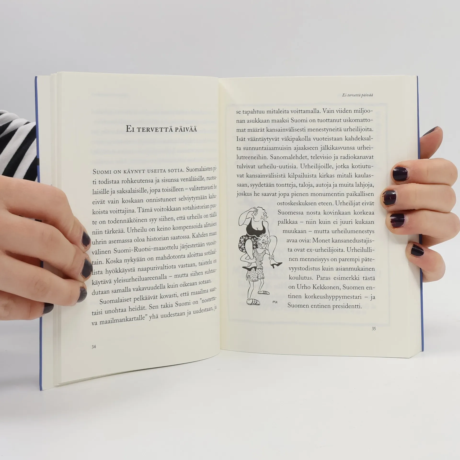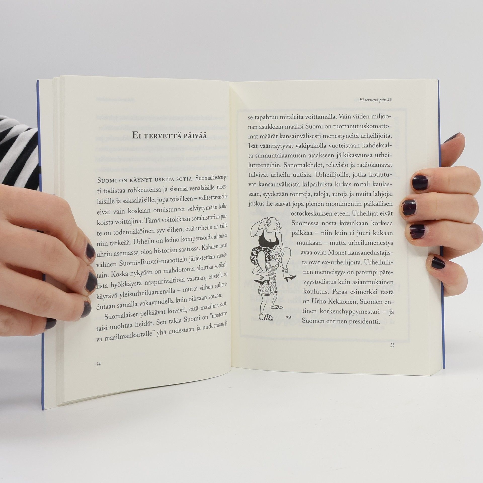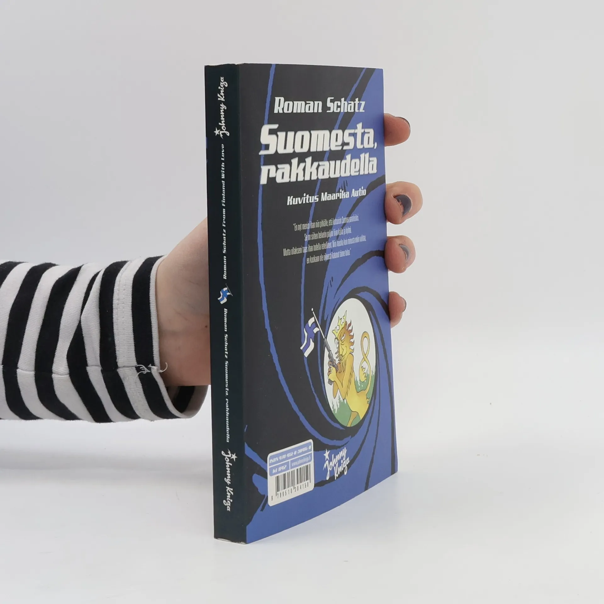The book contains both the English original (133 pages) and the Finnish translation of the same book (also 133 pages). (Kääntökirja)"I wouldn't go so far as to call Finland a paradise. It's too damn expensive and too damn cold. But to be brutally honest again: As much as I love to complain - I have never really regretted coming here."”En nyt menisi ihan niin pitkälle, että kutsuisin Suomea paratiisiksi. Se on siihen helvetin paljon liian kallis ja kylmä. Mutta ollakseni taas ihan todella rehellinen: Niin hauska kuin minusta onkin valittaa, en koskaan ole oikeasti katunut tänne tuloa.”