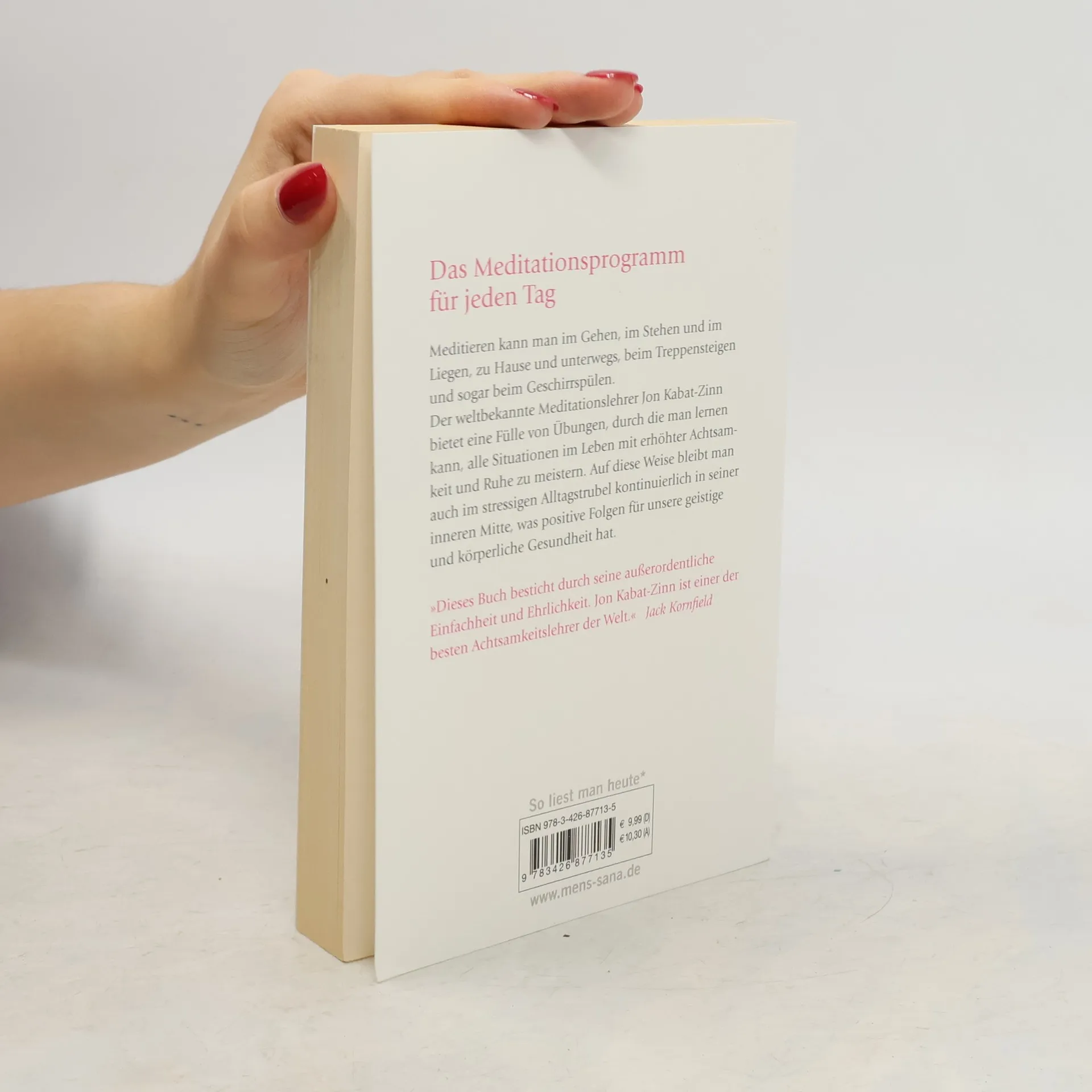 Meditieren kann man im Gehen, im Stehen und im Liegen, zu Hause und unterwegs, beim Treppensteigen und sogar beim Geschirrspülen. Der weltbekannte Meditationslehrer Jon Kabat-Zinn bietet eine Fülle von Übungen, durch die man lernen kann, alle Situationen im Leben mit erhöhter Achtsamkeit und Ruhe zu meistern. Auf diese Weise bleibt man auch im stressigen Alltagstrubel kontinuierlich in seiner inneren Mitte, was positive Folgen für unsere geistige und körperliche Gesundheit hat.