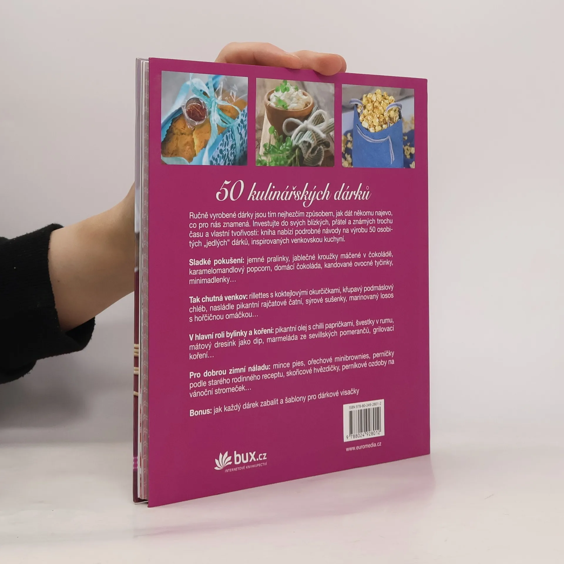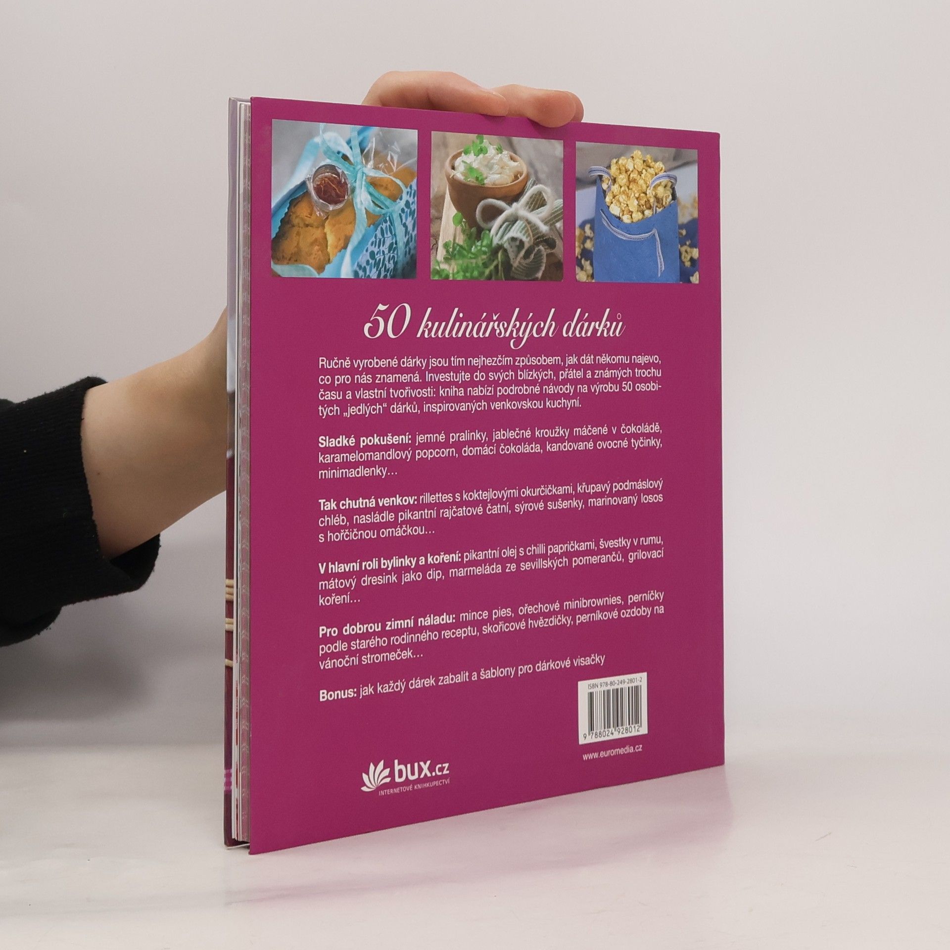 Originální jedlé dárky - Sladké a pikantní ve venkovském stylu Uvařit, upéct, ozdobit a vymyslet originální obal, to vše svědčí o pozornosti, kterou věnujeme ručně vyráběným dárkům. V knize najdete na padesát receptů. S vlastními domácími pralinkami, kandovanými citrusy, ořechovým chlebem v květináči, grilovacím kořením, ručně připraveným sýrem, mramorovanými vejci na řeřichovém lůžku nebo čočkovou polévkou, darovanou v kouzelném retro kastrůlku, darujete také radost a požitek. A možná i téma k hovoru. Vždyť nejhezčí dárek je ten, na který bude obdarovaný ještě dlouho vzpomínat.