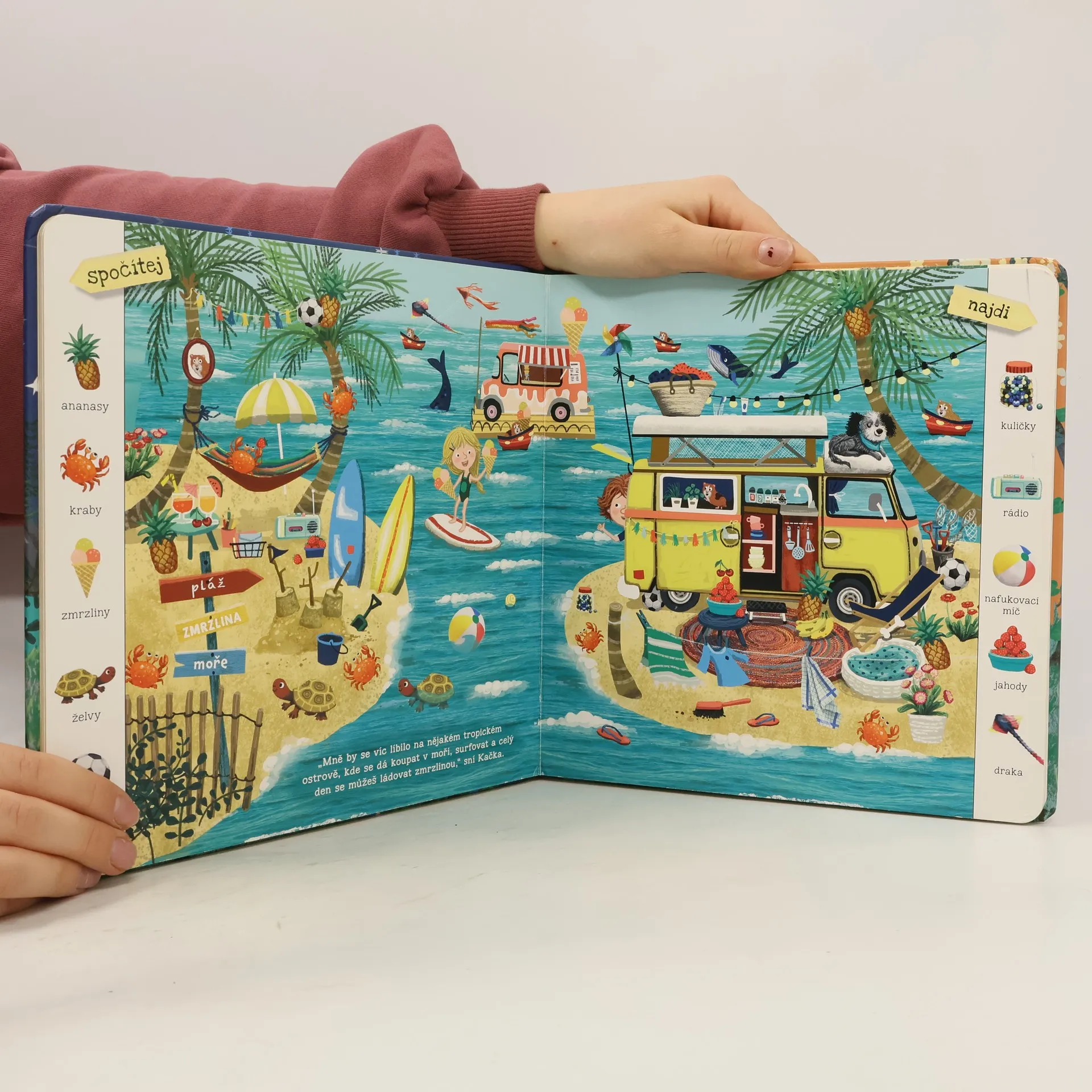 Kačka a Matěj sní v parku o tom, jaká dobrodružství by chtěli zažít. Malý čtenář tak spolu s nimi objevuje Divoký západ, neznámou planetu s mimozemšťany, ale zažívá i letní či zimní radovánky a podívá se na farmu nebo na safari. Na každé stránce je několik úkolů, při kterých si děti procvičí postřeh a základní počty.