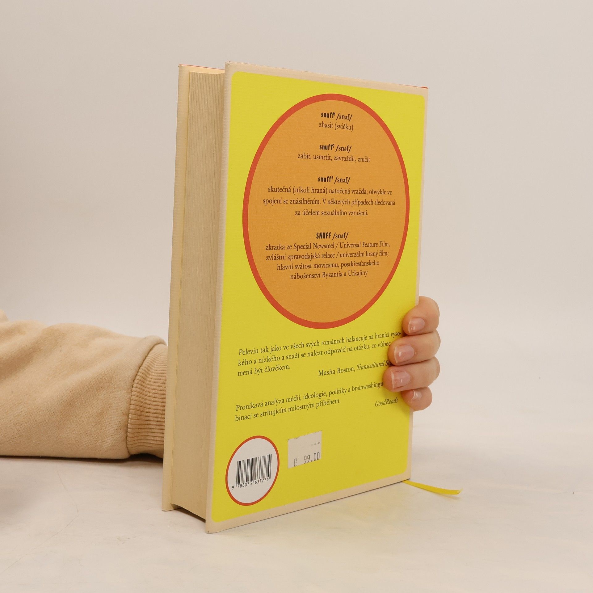 V groteskním postapokalyptickém románu SNUFF skloubil Viktor Pelevin jedinečnou společenskou satiru a trefnou karikaturu současného rozložení geopolitických sil. Damilola Karpov je bojový pilot-kameraman z Byzantia, gigantického bohatého města, které se vznáší nad zaostalou a barbarskou Urkajinou. Svými záběry se podílí na udržování neustálého válečného napětí a na utváření umělé reality. Vyprávěním o osudech dvou mladých urkajinských Orků a jedné byzantinské kybernetické ženy se špičkovou umělou inteligencí nám Damilola odhaluje mozaiku společenských manipulací, mechanismy mediálního zotročení a deformaci dekadentní doby, kdy pornografie a smrt diváka nudí a filmy přerostly v náboženský obřad. Román obsahuje mnoho narážek na dnešní sociální a politické poměry v Rusku i na Západě a na pozadí jejich vzájemné nevraživosti nám klade otázky o souvislostech mezi válkami a médii, o povaze zábavního průmyslu, ale i o vztahu lidství a technologie.
