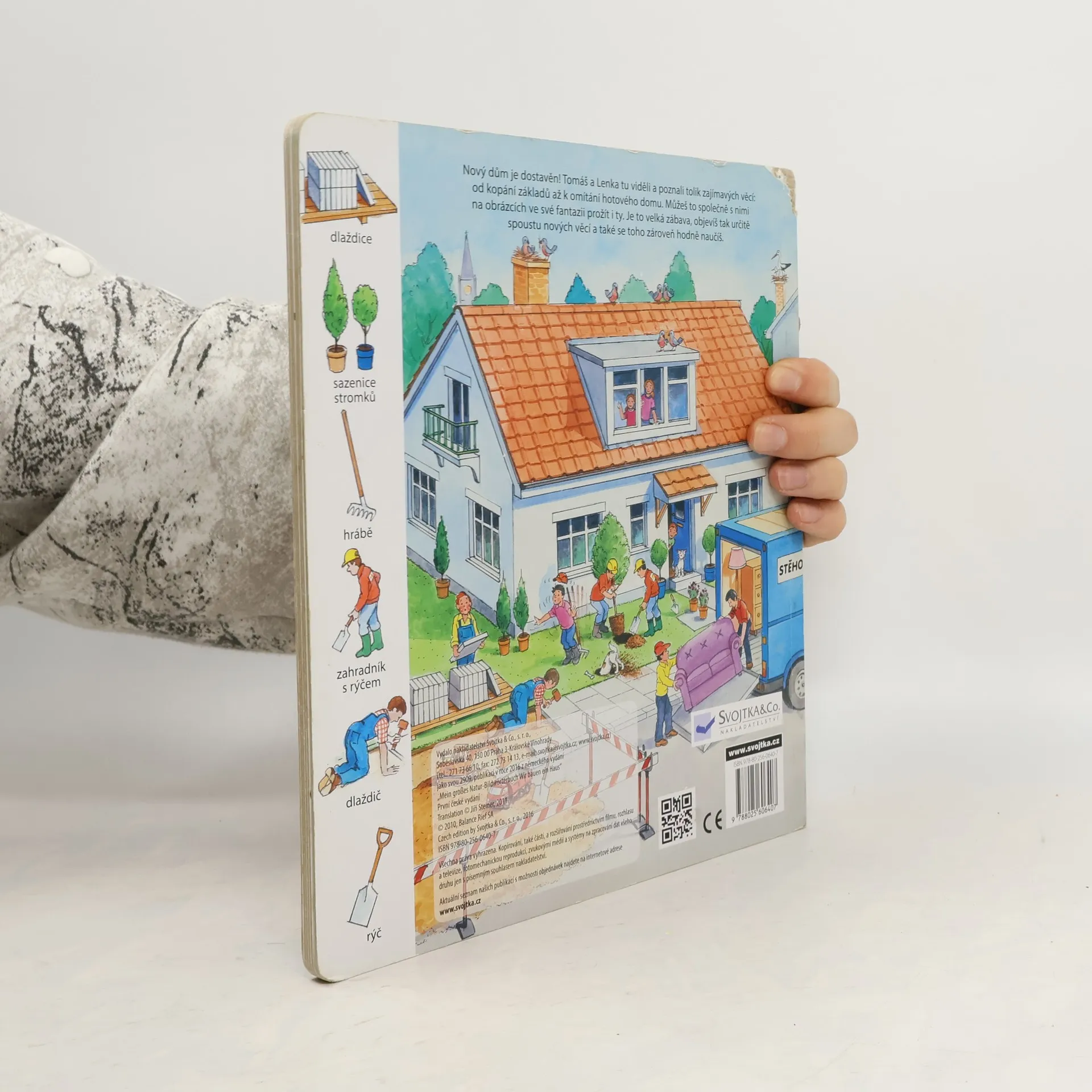 Toto leporelo je určeno pro děti, které se zajímají o to, co všechno se děje na stavbě. Seznamuje malé čtenáře s auty, stroji, nástroji a zařízeními, které zde mohou vidět při práci. Nechybějí ani jednoduché otázky, na které děti najdou srozumitelné odpovědi. Knížka je doplněna půvabnými názornými barevnými ilustracemi a rastrem s podrobnými vyobrazeními.