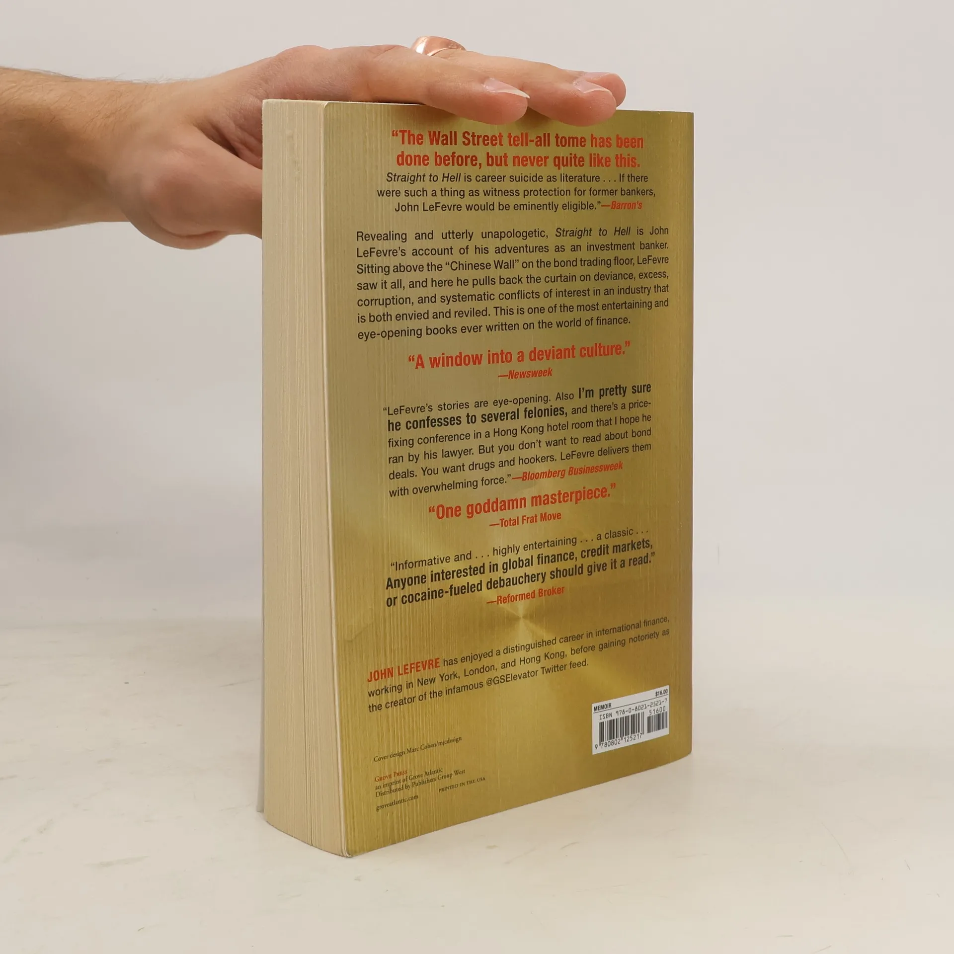 "Over the past three years, the notorious @GSElevator Twitter feed has offered a hilarious, shamelessly voyeuristic look into the real world of international finance. Hundreds of thousands followed the account, Goldman Sachs launched an internal investigation, and when the true identity of the man behind it all was revealed, it created a national media sensation--but that's only part of the story. Where @GSElevator captured the essence of the banking elite with curated jokes and submissions overheard by readers, Straight to hell adds John LeFevre's own story--an unapologetic and darkly funny account of a career as a globe-conquering investment banker spanning New York, London, and Hong Kong."--Amazon.com.