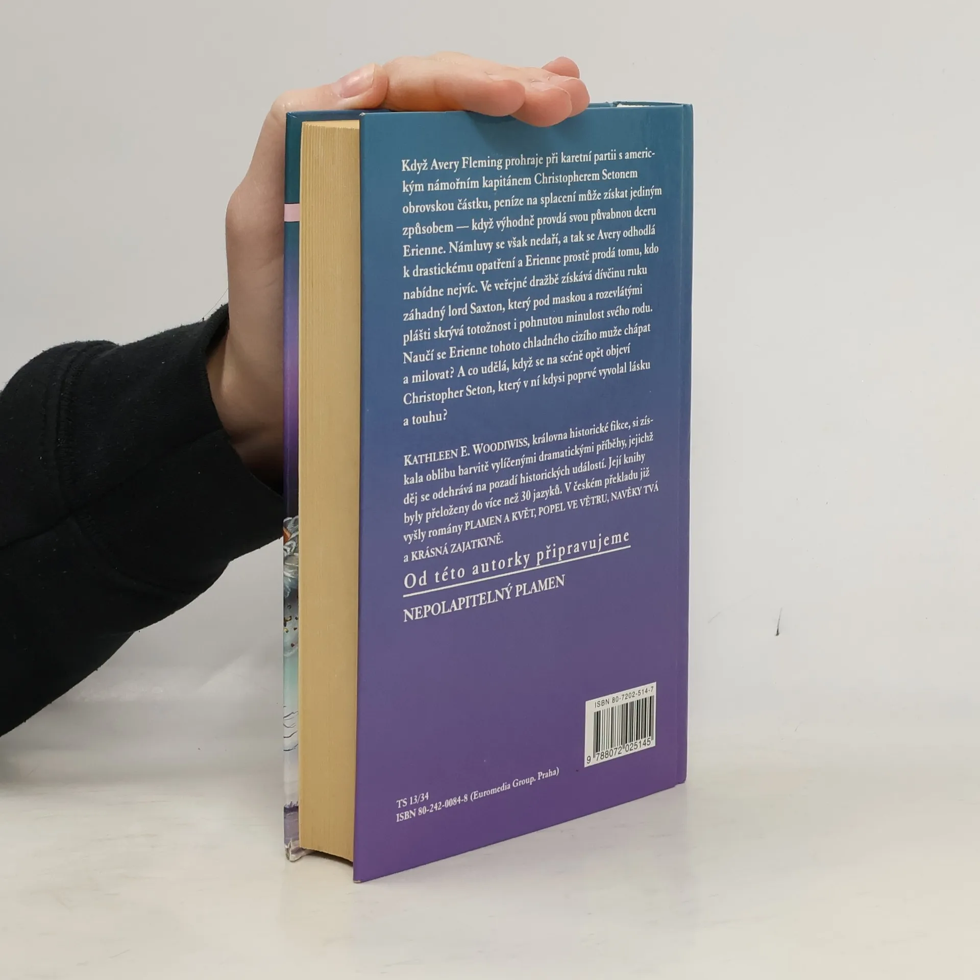Severní Anglie 1792 Když Avery Fleming prohraje při karetní partii s americkým námořním kapitánem Christopherem Setonem obrovskou částku, peníze na splacení může získat jediným způsobem - když výhodně provdá svou půvabnou dceru Erienne. Námluvy se však nedaří, a tak se Avery odhodlá k drastickému opatření a Erienne prostě prodá tomu, kdo nabídne nejvíc. Ve veřejné dražbě získává dívčinu ruku záhadný lord Saxton, který pod maskou a rozevlátými plášti skrývá totožnost i pohnutou minulost svého rodu. Naučí se Erienne tohoto chladného cizího muže chápat a milovat? A co udělá, když se na scéně opět objeví Christopher Seton, který v ní kdysi poprvé vyvolal lásku a touhu? Kathleen E. Woodiwiss patří k nejslavnějším autorkám historických romancí a její knihy se překládvají do více než třiceti jazyků.