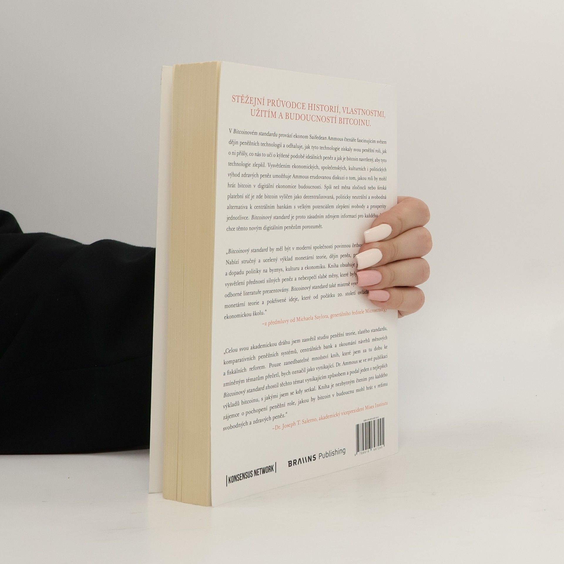 Stěžejní průvodce historií, vlastnostmi, užitím a budoucností bitcoinu. Ekonom Saifedean Ammous provází čtenáře fascinujícím světem peněžních technologií, odhaluje, jak tyto technologie získaly svou peněžní roli, jak o ni přišly a co nás to učí o ideálních penězích. Vysvětlením ekonomických, společenských, kulturních a politických výhod zdravých peněz umožňuje Ammous erudovanou diskuzi o roli bitcoinu v digitální ekonomice budoucnosti. Bitcoin je zde vylíčen jako decentralizovaná, politicky neutrální a svobodná alternativa k centrálním bankám, s potenciálem zlepšit svobodu a prosperitu jednotlivce. Kniha je zásadním zdrojem informací pro každého, kdo chce porozumět těmto novým digitálním penězům. „Bitcoinový standard by měl být povinnou četbou pro každého. Nabízí stručný a ucelený výklad monetární teorie, dějin peněz a dopadu politiky na byznys, kulturu a ekonomiku. Obsahuje jedno z nejlepších vysvětlení předností silných peněz a nebezpečí slabé měny v moderní odborné literatuře. Mistrně vyvrací mýty moderní monetární teorie a pokřivené ideje ovládající fiatovou ekonomickou školu.“ –z předmluvy od Michaela Saylora, generálního ředitele Microstrategy „Dr. Ammous se ve své publikaci zhostil těchto témat vynikajícím způsobem a podal jeden z nejlepších výkladů bitcoinu, s jakými jsem se kdy setkal. Kniha je nezbytným čtením pro každého, kdo chce pochopit peněžní roli bitcoinu v budoucnu.“ –Dr. Joseph T. Salerno, akademický vi