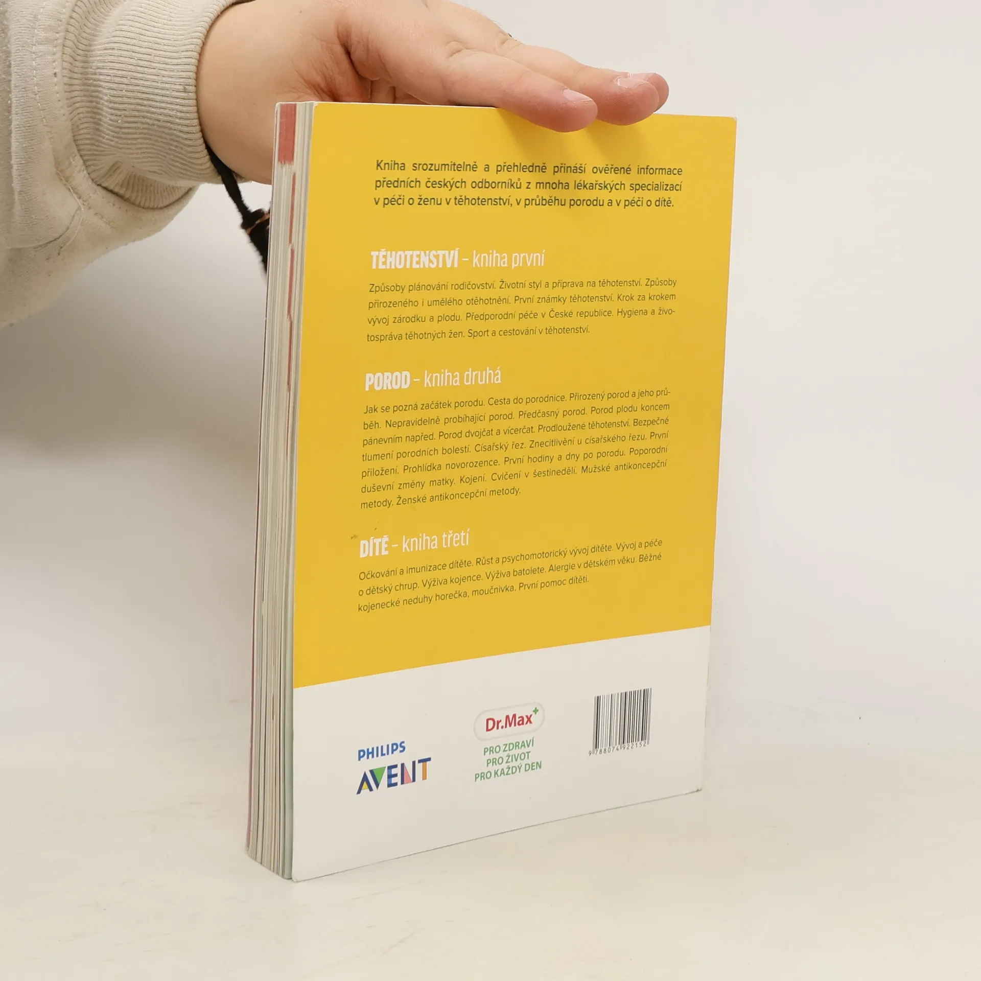 Kniha srozumitelně a přehledně přináší ověřené informace předních českých odborníků z mnoha lékařských oborů o těhotenství, porodu a péči o dítě. Jak se pozná začátek porodu. Cesta do porodnice. Porod přirozený. Průběh porodu. Nepravidelně probíhající porod. Předčasný porod. Porod plodu koncem pánevním napřed. Porod dvojčat a vícerčat. Prodloužené těhotenství. Bezpečné tlumení porodních bolestí. Císařský řez. Znecitlivění u císařského řezu. Prohlídka novorozence. První hodiny a dny po porodu. Poporodní duševní změny matky. Kojení. Cvičení v šestinedělí. Mužské antikoncepční metody. Ženské antikoncepční metody.