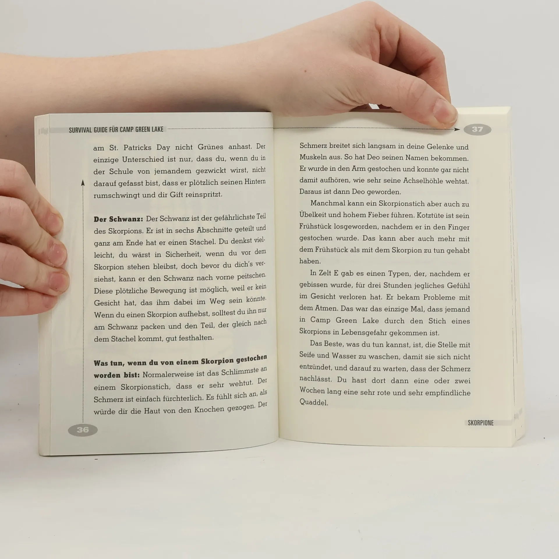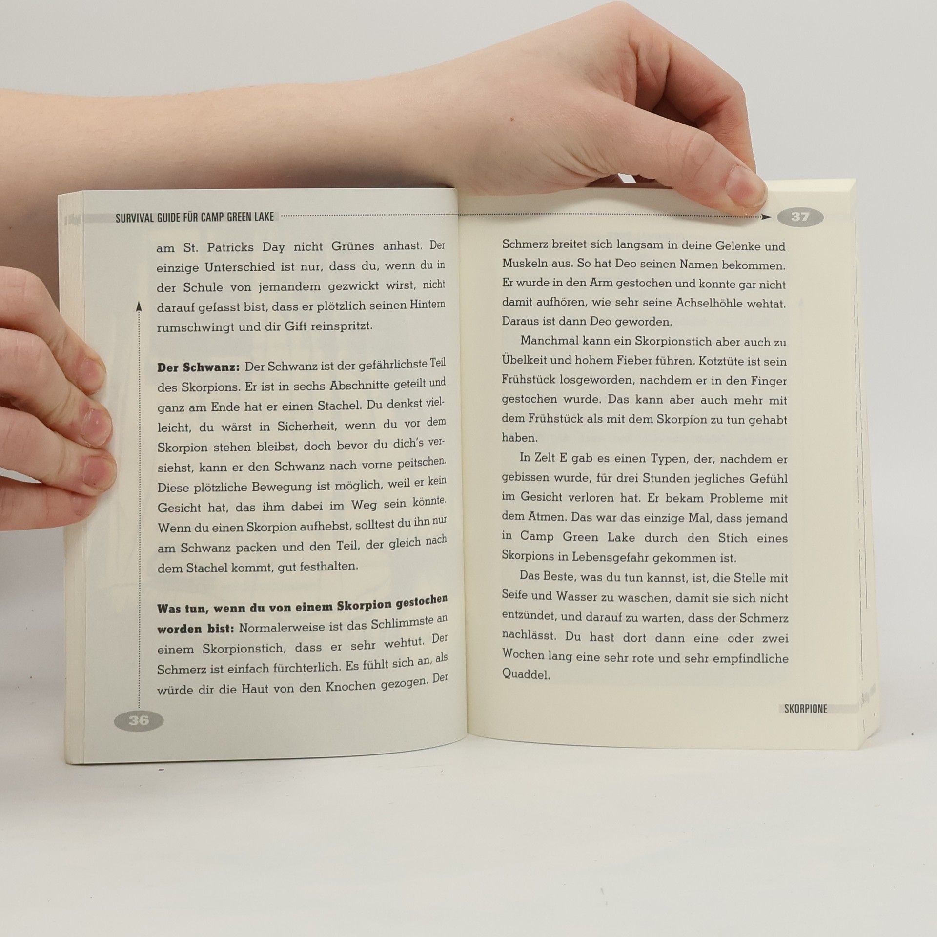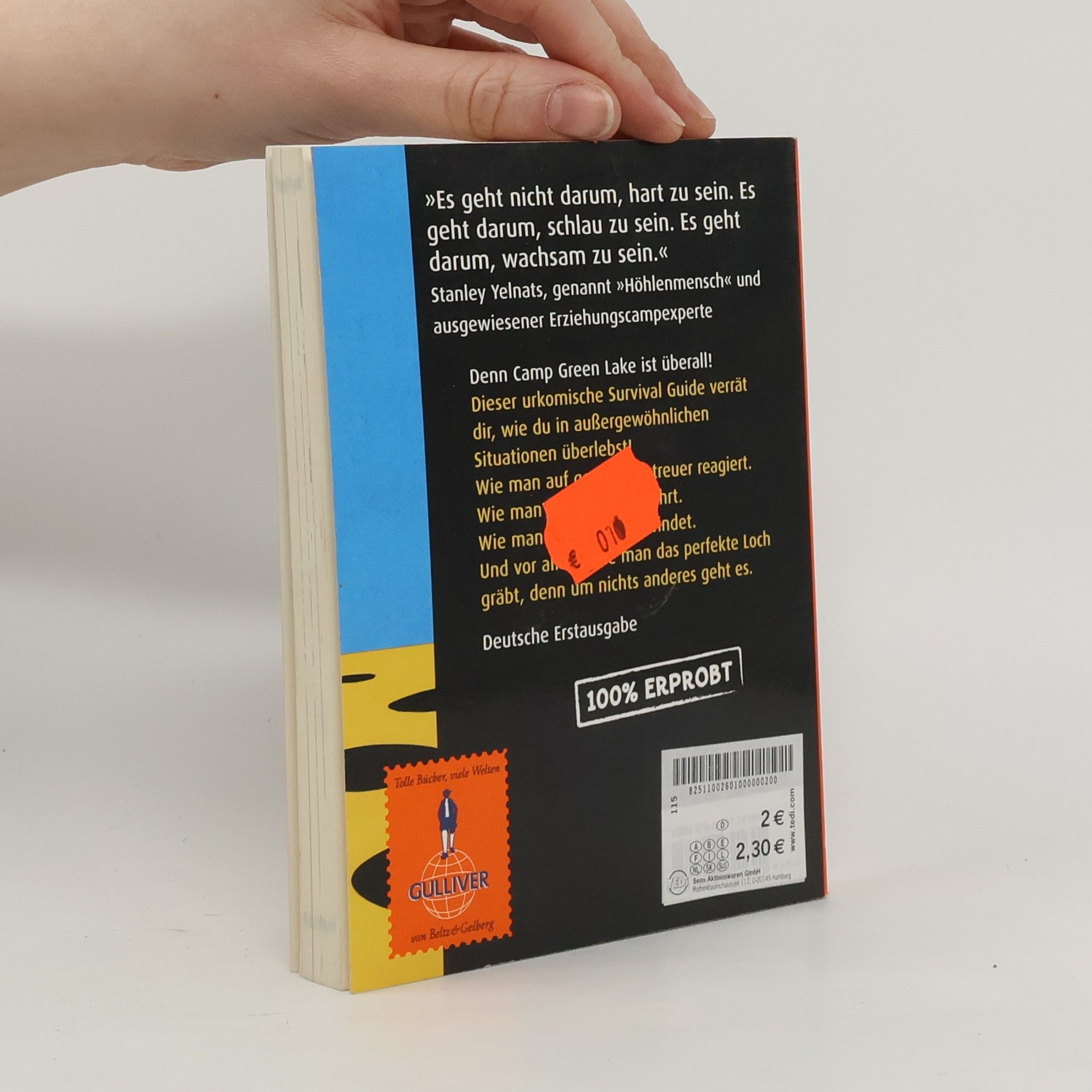 'This is the bible of the Texas desert!' Publishers Weekly 'Wie überlebt man im Erziehungscamp Green Lake?' A gar nicht B man gräbt das perfekte Loch C wo? D man liest diesen Survival Guide, denn: Stanley Yelnats – genannt „Höhlenmensch“ – kennt die Antwort! Er weiß, wie hart das Leben in „Camp Green Lake“ ist. Man sitzt mitten in der Wüste fest, muss jeden Tag ein Loch graben, es wimmelt von giftigen Skorpionen und jeder Menge skurriler Typen. Doch Stanley hat Tipps und Tricks um mit gereizten Betreuern, gelb gefleckten Eidechsen und undichten Wasserflaschen fertig zu werden. Und er weiß, wie man das perfekte Loch gräbt und wie wichtig es ist, Freunde im Camp zu finden. Das alles hat er Louis Sachar verraten, der diesen urkomischen Survival Guide geschrieben hat.