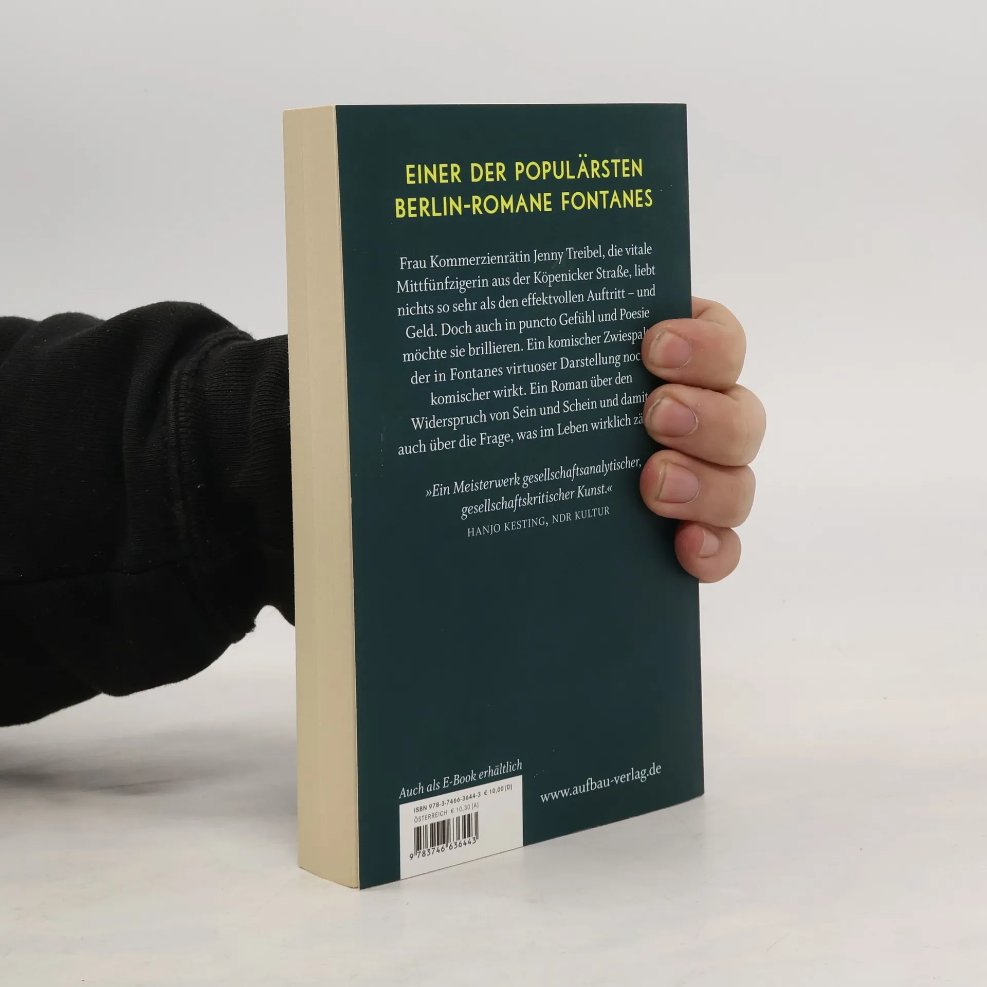 Einer der populärsten Berlin-Romane Fontanes. Frau Kommerzienrätin Jenny Treibel, die vitale Mittfünfzigerin aus der Köpenicker Straße, liebt nichts so sehr als den effektvollen Auftritt – und Geld. Doch auch in puncto Gefühl und Poesie möchte sie brillieren. Ein komischer Zwiespalt, der in Fontanes virtuoser Darstellung noch komischer wirkt. Ein Roman über den Widerspruch von Sein und Schein und damit auch über die Frage, was im Leben wirklich zählt. „Ein Meisterwerk gesellschaftsanalytischer, gesellschaftskritischer Kunst.“ Hanjo Kesting, NDR Kultur
