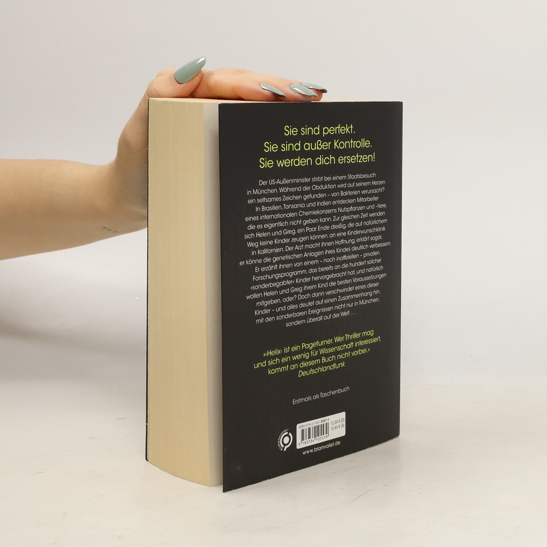 »›Helix‹ ist ein Pageturner. Wer Thriller mag und sich ein wenig für Wissenschaft interessiert, kommt an diesem Buch nicht vorbei.« Deutschlandfunk »Auslese kompakt« Sie sind perfekt. Sie sind außer Kontrolle. Sie werden dich ersetzen! Der US-Außenminister stirbt bei einem Staatsbesuch in München. Während der Obduktion wird auf seinem Herzen ein seltsames Zeichen gefunden – von Bakterien verursacht? In Brasilien, Tansania und Indien entdecken Mitarbeiter eines internationalen Chemiekonzerns Nutzpflanzen und –tiere, die es eigentlich nicht geben kann. Zur gleichen Zeit wenden sich Helen und Greg an eine Kinderwunschklinik in Kalifornien. Der Arzt erzählt ihnen von einem inoffiziellen Forschungsprogramm, das über hundert »sonderbegabter« Kinder hervorgebracht hat. Doch dann verschwindet eines dieser Kinder, und alles deutet auf einen Zusammenhang mit sonderbaren Ereignissen überall auf der Welt hin …»Große Fragen, großes Kino.« ZEIT Wissen»Diesmal geht es um Gentechnik, und wieder überkommt einen beim Lesen das pure Grauen …« NDR Kultur Lesen Sie auch den aktuellen Thriller von Marc Elsberg: °C - Celsius! Ein Klimathriller, der alles auf den Kopf stellt. Außerdem erhältlich: BLACKOUT. Morgen ist es zu spät. Auch als Premiumausgabe – mit einer exklusiven Kurzgeschichte von Marc Elsberg und weiteren Extras! ZERO. Sie wissen, was du tust. GIER. Wie weit würdest du gehen? Der Fall des Präsidenten