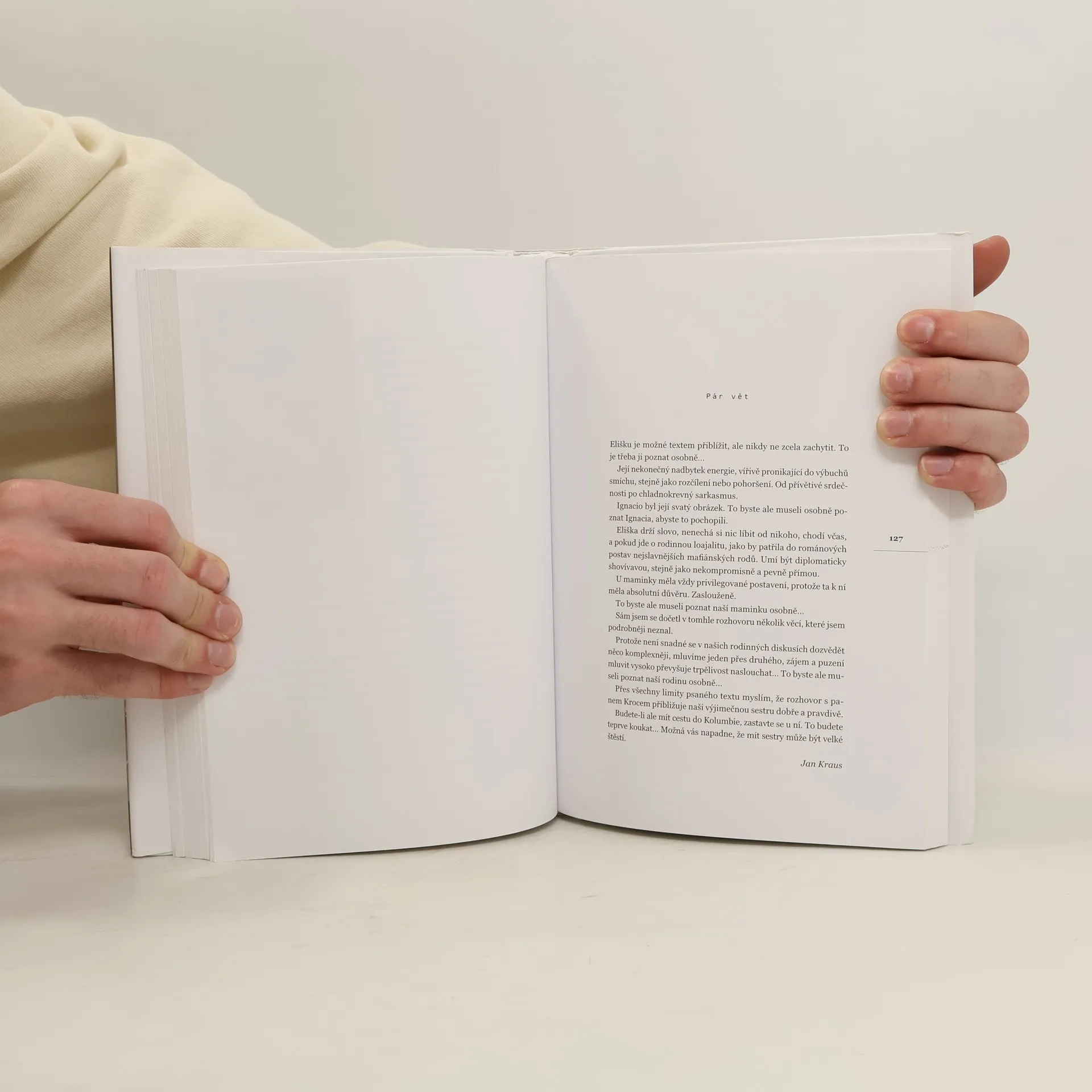 Fascinující příběh Elišky Krausové-Chaves, sestry spisovatele Ivana Krause a dalších prominentních osobností, začíná na jaře 1968, kdy se vydává do Kolumbie zlepšit svou španělštinu. V rozhovoru s moderátorem Českého rozhlasu Vladimírem Krocem popisuje, jak byla Amerika pro ni zcela jiným pohledem na svět. Po okupaci Československa 21. srpna se rozhodla v Kolumbii zůstat a díky silným genům a osudovému muži překonala různé nástrahy a vybudovala si úspěšný život. Eliška se setkává s mnoha známými osobnostmi, od herců po válečné hrdiny, a poznáváme ji jako profesorku francouzštiny, telefonní spojovatelku, prodavačku paruk či příležitostnou televizní herečku. Její příběh nabízí pohled do života Kolumbijců a do historie rodiny Krausových, zpopularizované zejména Ivanem a Janem. Eliška je popisována jako loajální a pevná postava, která umí být diplomaticky shovívavá i nekompromisně přímá. Její vyprávění je protkáno typickou „krausovskou“ přímočarostí a humorem, čtenář ocení krásný jazyk a styl, kterým se po letech na jiné polokouli vyjadřuje. Text doprovází množství fotografií z rodinného archivu.
