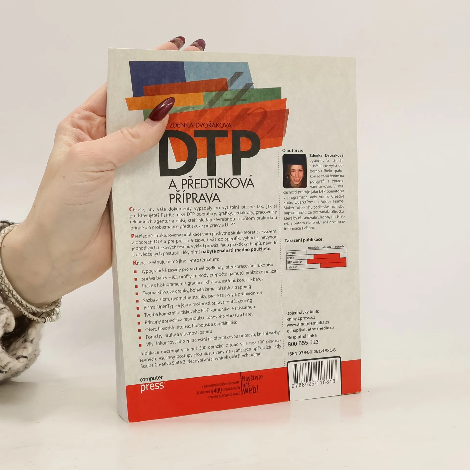 Chcete, aby vaše dokumenty vypadaly po vytištění přesně tak, jak si představujete? Patříte mezi DTP operátory, grafiky, redaktory, pracovníky reklamních agentur a další, kteří hledají praktickou příručku o předtiskové přípravě a DTP? Publikace vám poskytne široké teoretické zázemí v oborech DTP a pre-pressu a zasvětí vás do specifik jednotlivých tiskových řešení. Výklad doplňují praktické tipy, návody a osvědčené postupy pro snadné použití nabytých znalostí. Kniha se zaměřuje na typografické zásady, správu barev, práci s histogramem a gradační křivkou, tvorbu křivkové grafiky, sazbu a zlom, písma OpenType a správu fontů. Dále se věnuje tvorbě korektního tiskového PDF, komunikaci s tiskárnou a reprodukci tónového obrazu. Obsahuje také informace o různých tiskových technikách, formátech papíru a vlivu dokončovacího zpracování na předtiskovou přípravu. Publikace je bohatě ilustrována více než 500 obrázky, včetně více než 100 plnobarevných. Všechny postupy jsou prezentovány na grafických aplikacích Adobe Creative Suite 3 a nechybí slovníček důležitých pojmů.