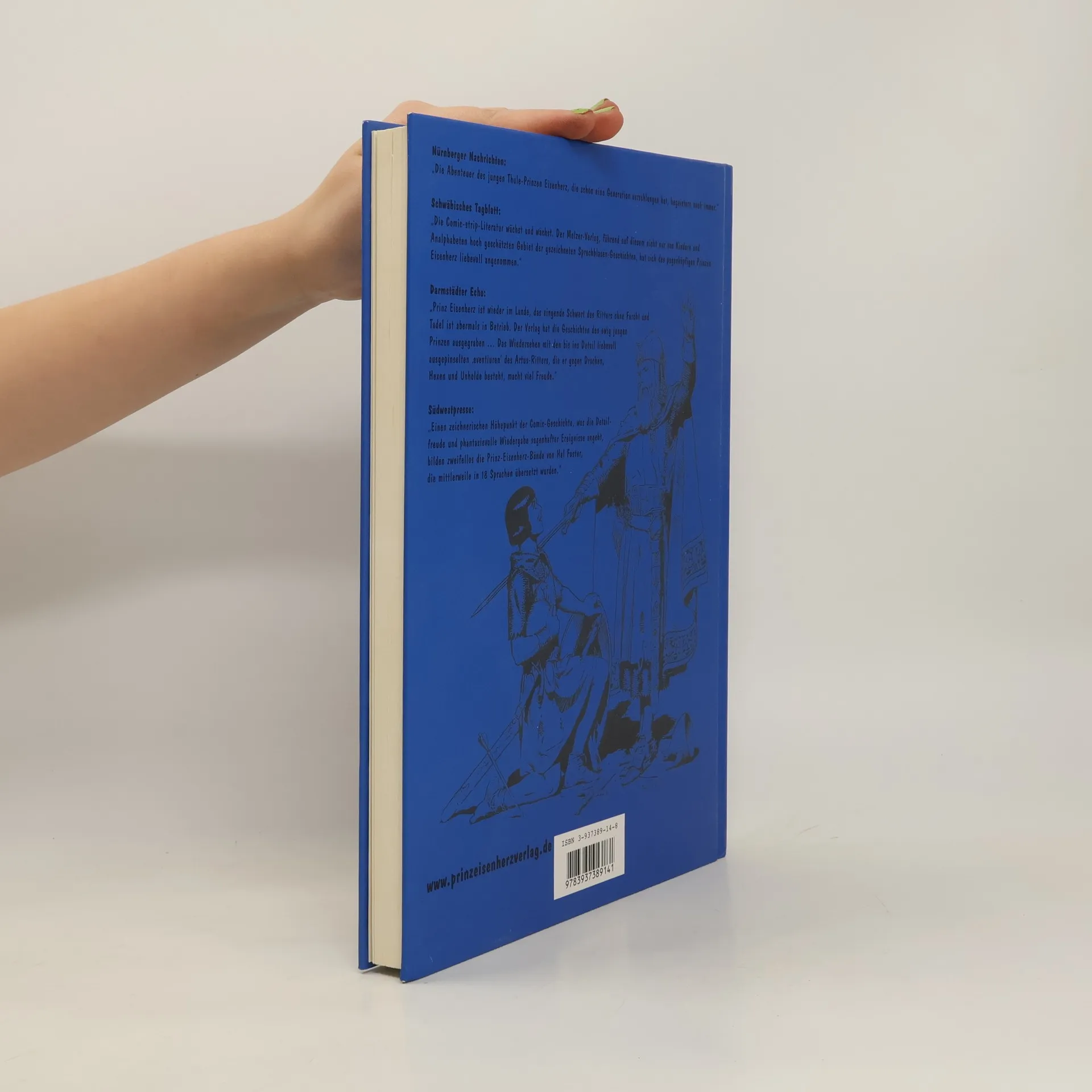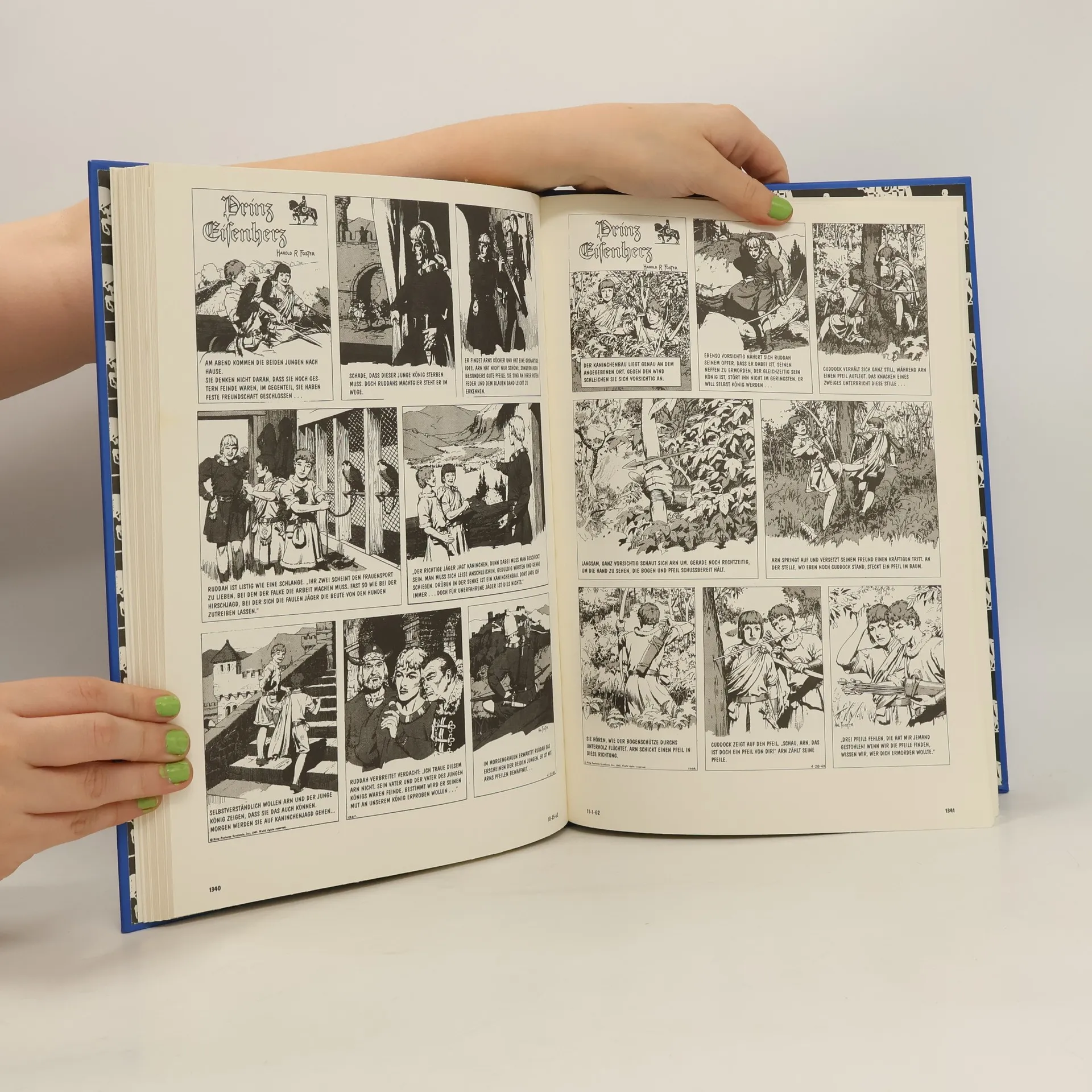 Schwarz-weiss Ausgabe. Klassische Comic-Panells. „Prinz Eisenherz“ ist das große Epos um einen Prinzen und sein „Singendes Schwert“, in dem all die bekannten Gestalten der Artussage und noch einige mehr zum Leben erweckt werden. Lancelot, Gawain, Modred, Merlin und Königin Guinevere, sie alle sind da und bevölkern das fernhin leuchtende Camelot, Arthurs herrliche Burg. Fosters Genie lässt das Zeitalter der fahrenden Ritter, der Ehre und Minne auferstehen