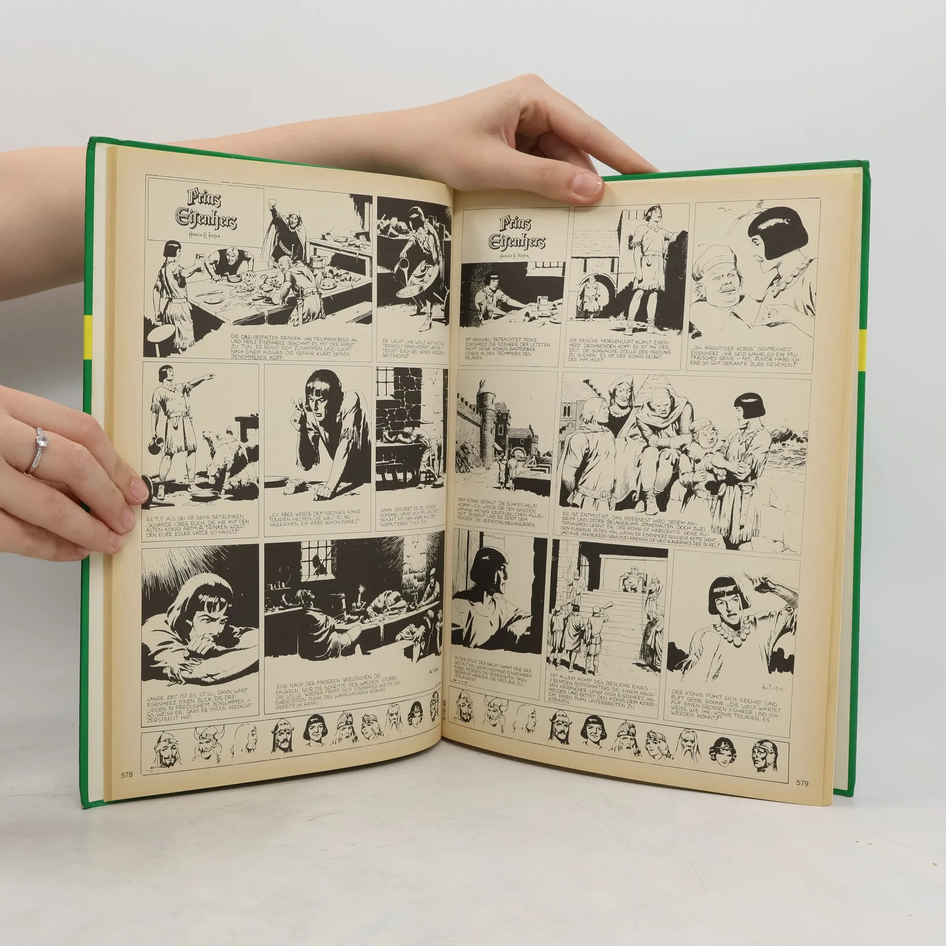 Schwarz-weiss Ausgabe. Klassische Comic-Panells. „Prinz Eisenherz“ ist das große Epos um einen Prinzen und sein „Singendes Schwert“, in dem all die bekannten Gestalten der Artussage und noch einige mehr zum Leben erweckt werden. Lancelot, Gawain, Modred, Merlin und Königin Guinevere, sie alle sind da und bevölkern das fernhin leuchtende Camelot, Arthurs herrliche Burg. Fosters Genie lässt das Zeitalter der fahrenden Ritter, der Ehre und Minne auferstehen
