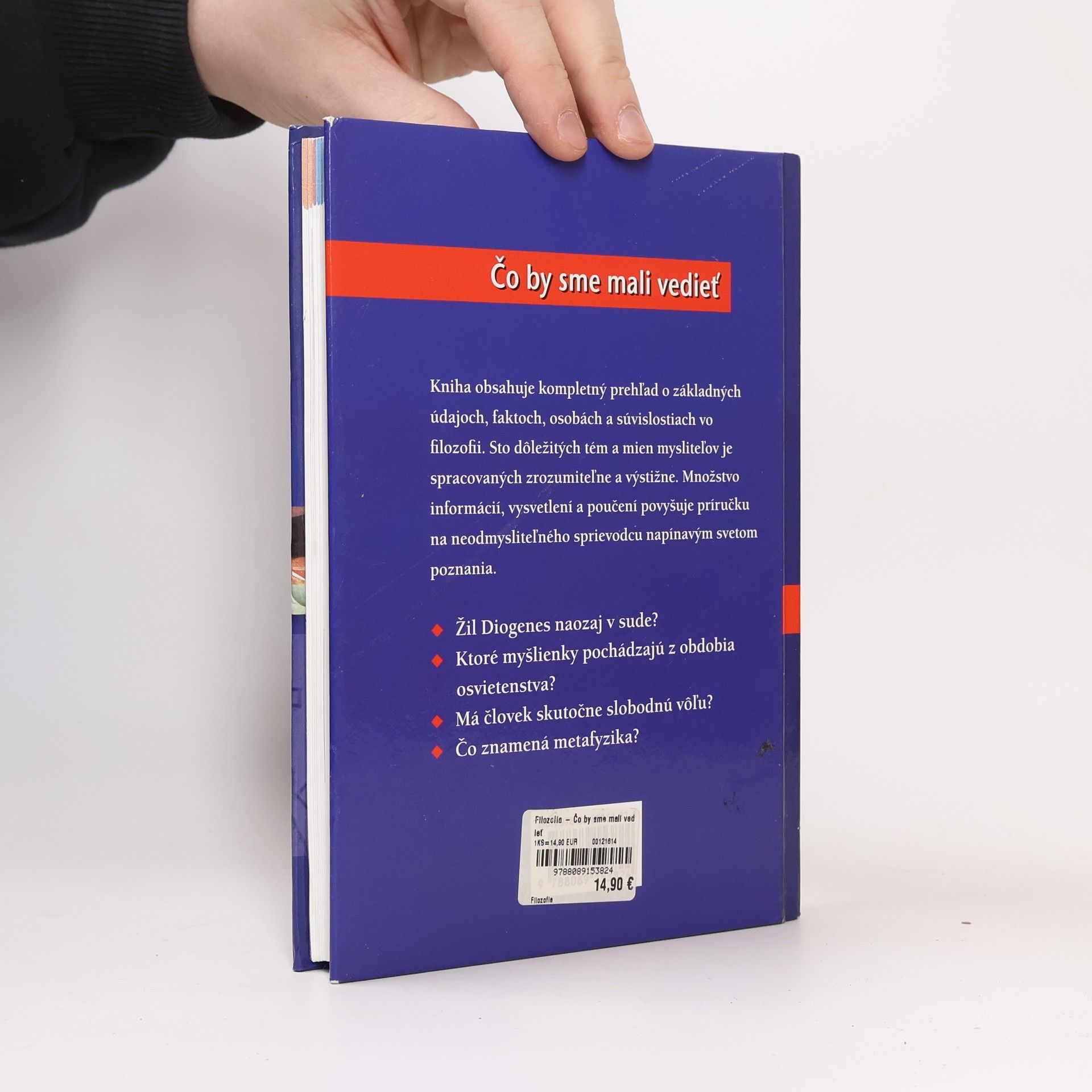 Kniha obsahuje kompletný prehľad ozákladných údajoch, faktoch, osobách a súvislostiach vo filozofii. Sto dôležitých tém a mysliteľov je spracovaných zrozumiteľne a výstižne. Množstvo informácií, vysvetlení a poučení povyšuje príručku na neodmysliteľného sprievodcu napínavým svetom poznania.