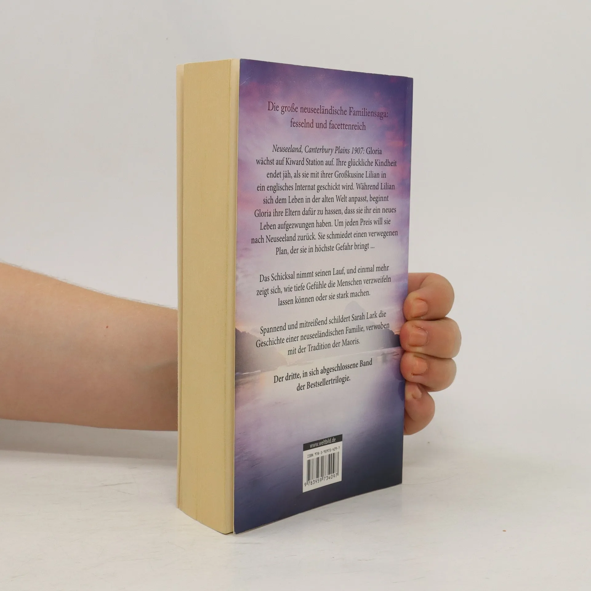 Neuseeland, Canterbury Plains 1907: Für Gloria bricht eine Welt zusammen, als sie Kiward Station verlassen muss. Mit ihrer Großcousine Lilian tritt sie die Reise nach England an, wo die beiden jungen Mädchen ein Internat besuchen sollen. Während Lilian sich rasch einlebt, fühlt sich Gloria fremd und ausgeschlossen. Um jeden Preis will sie nach Neuseeland zurück und schmiedet einen verwegenen Plan, der sie in höchste Gefahr bringt. So nimmt das Schicksal seinen Lauf, und einmal mehr zeigt sich, wie tiefe Gefühle die Menschen verzweifeln lassen - oder stark machen. Spannend und mitreißend schildert Sarah Lark die Geschichte einer neuseeländischen Familie, verwoben mit der Tradition der Maoris. Der dritte, in sich abgeschlossene Band der Bestsellertrilogie