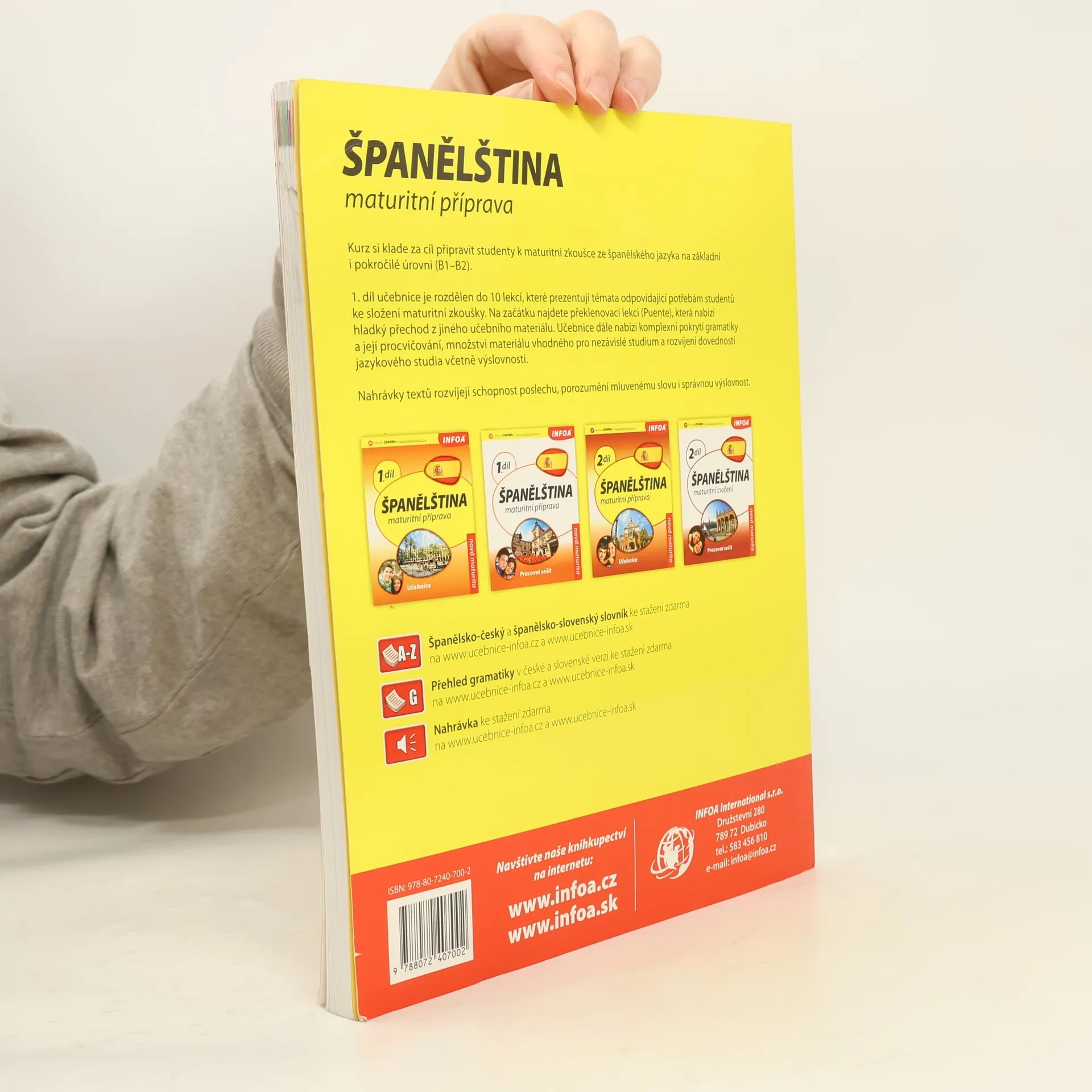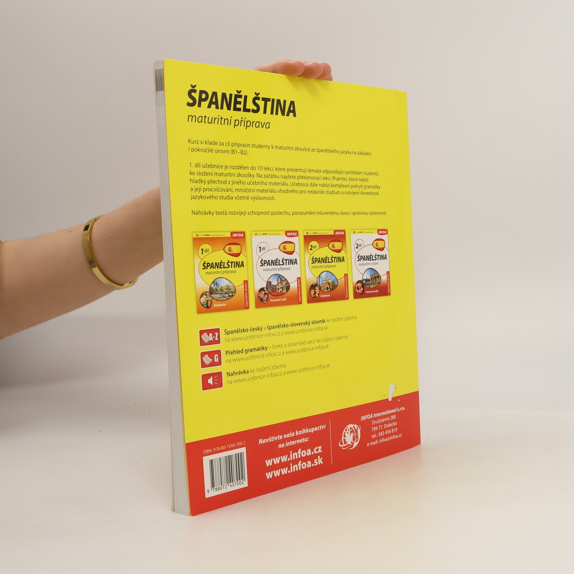 Učebnice je koncipována pro novou státní maturitu. Obsahuje témata jako Člověk, Dům, Škola, Práce, Zdraví, Rodina, Nákupy, Sport, Stát a společnost atd. Každé téma obsahuje lexikální cvičení, mluvnická cvičení, čtení, poslech, konverzaci a písemná cvičení.