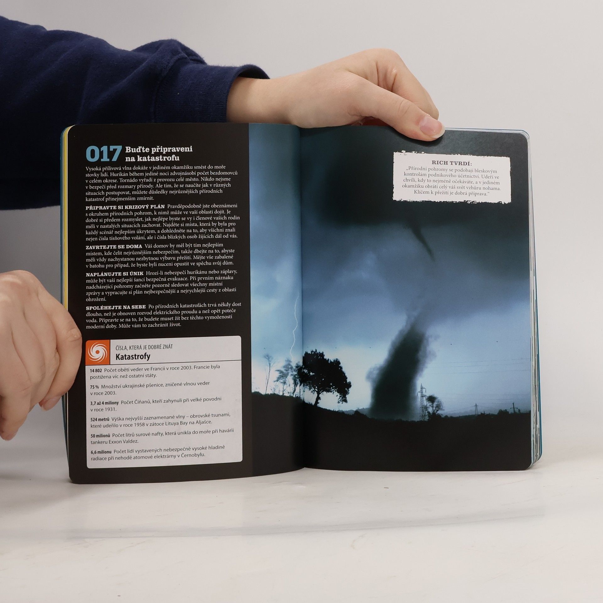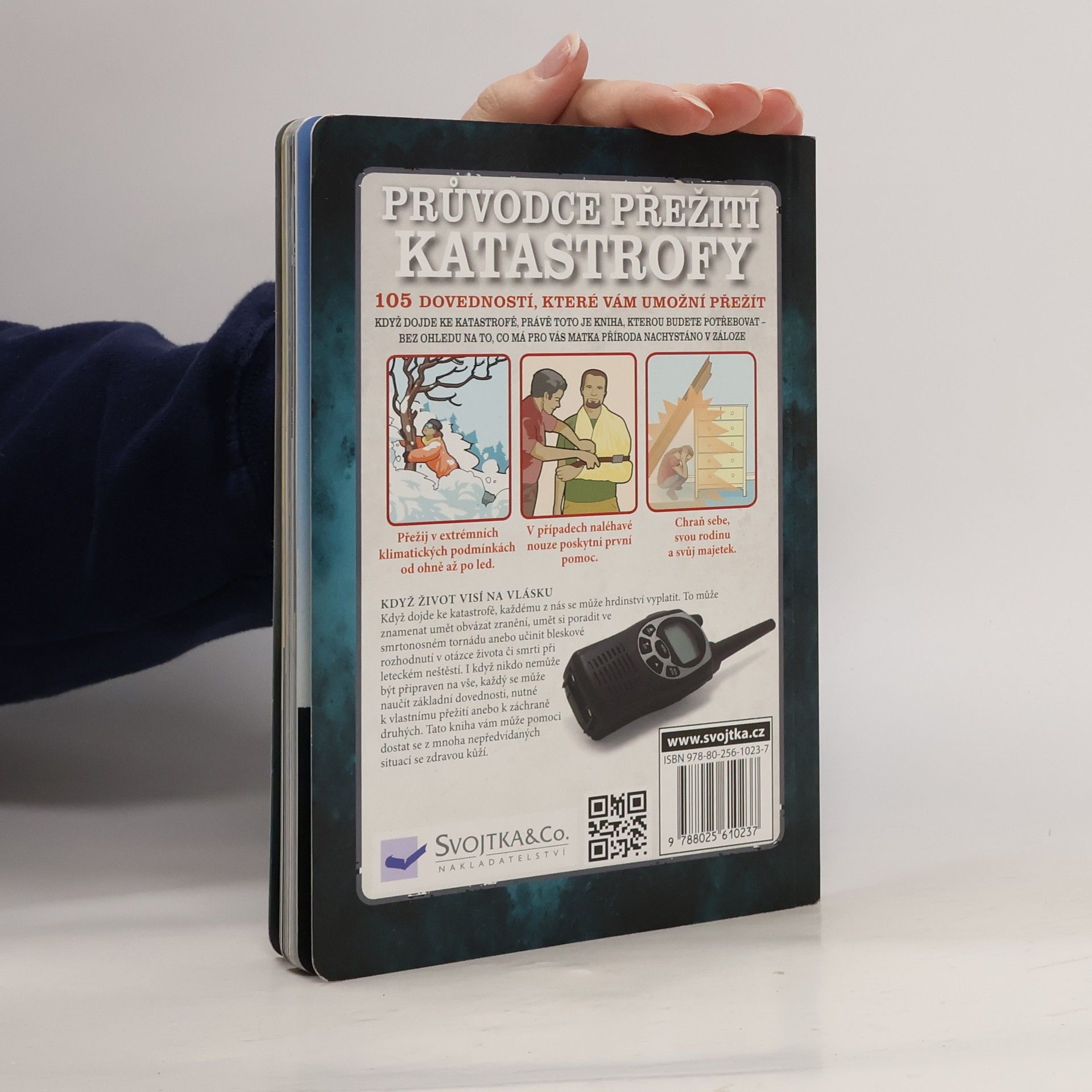 Když dojde ke katastrofě, každému z nás se mohou vyplatit dovednosti, které nám umožní přežít. I když nikdo nemůže být připraven na vše, každý se muže naučit alespoň tem základním, nutným k vlastnímu přežití anebo k záchraně druhých. V této knize najdete 105 takových dovedností, které jsou srozumitelně popsány a doplněny názornými kresbami a fotografiemi. Ať jde o přežití v extrémních klimatických podmínkách nebo poskytnutí první pomoci, tato kniha vám muže pomoci dostat se z mnoha nepředvídaných situací, i když už budete mít pocit, že váš život visí na vlásku!