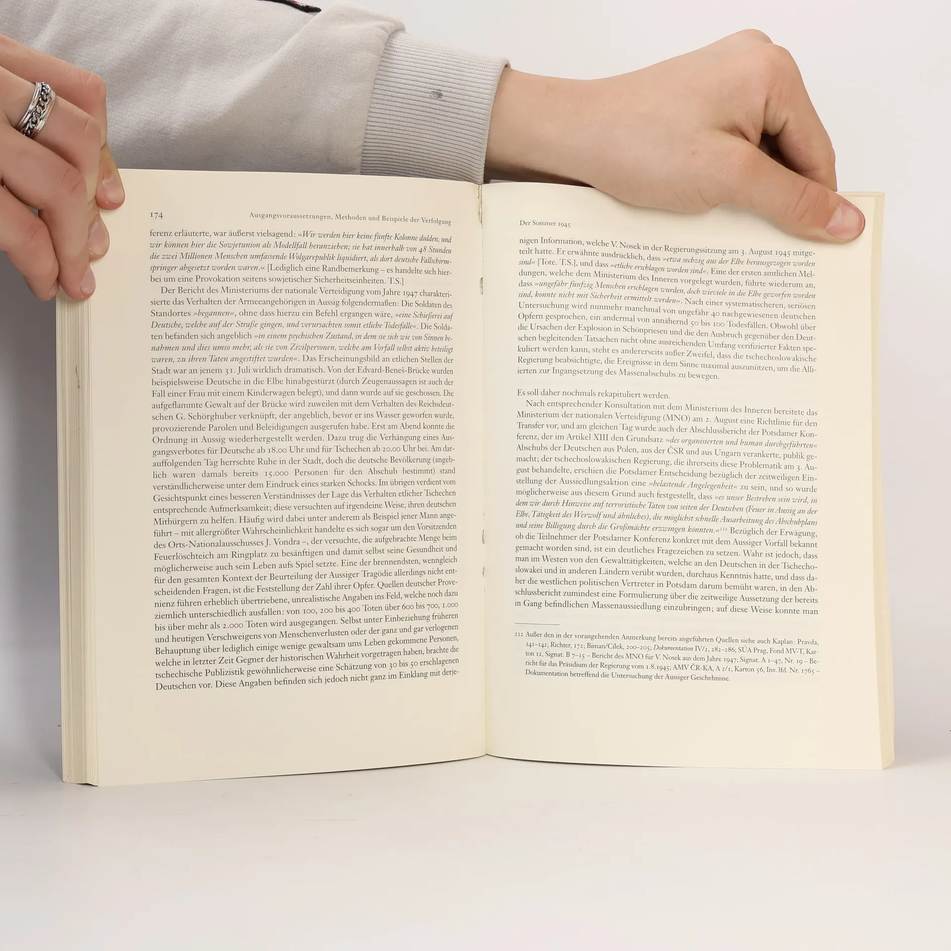 Das Buch Verfolgung 1945 arbeitet erstmals von tschechischer Seite bisher nur ungenügend geklärte Fragen der Nachkriegsrepression gegenüber der so genannten staatlich unzuverlässigen Bevölkerung, also vor allem der Deutschen in Böhmen, Mähren und Schlesien auf. Im Zentrum stehen Begebenheiten, die sich in der Zeit von Mai bis Herbst 1945 zugetragen haben: „wilde“ Vertreibungen, Abrechnungen, Fälle von brutalem Umgang mit Deutschen und Personen, die als Verräter und Kollaborateure ausgewiesen wurden (mit den Verhältnissen in den verschiedenen Lagern, welche in den böhmischen Ländern in den Jahren 1945 bis 1948 existierten, beschäftigt sich der Autor in einer eigenständigen Studie). In tschechischer Sprache erschien das Buch zu einer Zeit, als die Verhandlungen über die gemeinsame tschechisch-deutsche Erklärung in die entscheidende Phase eintraten, und liegt nun erstmals in deutscher Übersetzung vor.