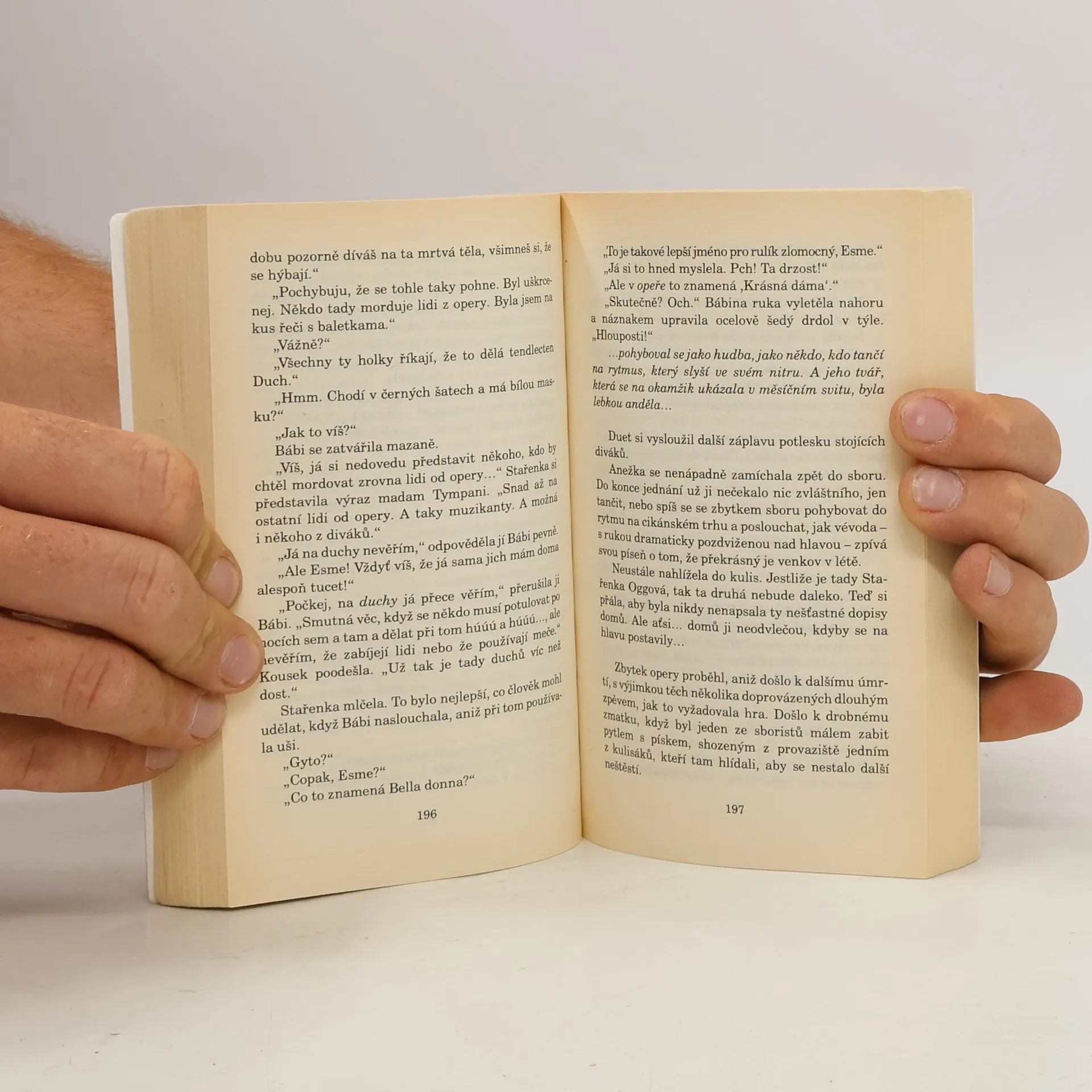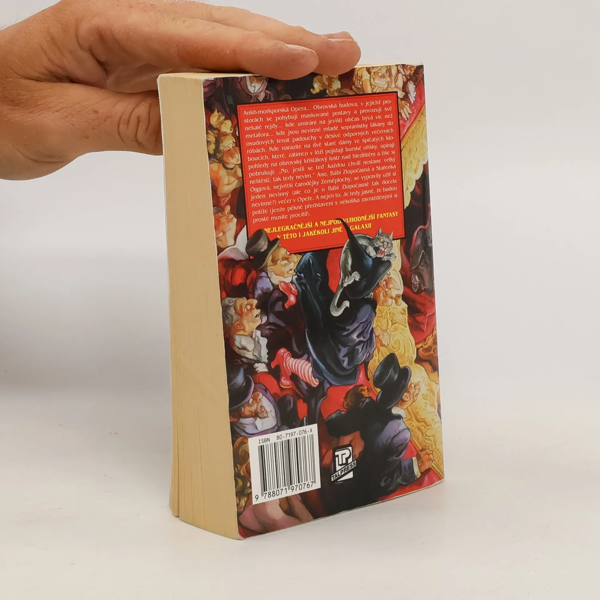 Anhk-morporkská Opera... obrovská budova, v jejíchž prostorách se pohybují maskované postavy a provozují své nekalé rejdy... kde umírání na jevišti občas bývá víc než metafora ... kde jsou nevinné mladé sopranistky lákány do osudových tenat padouchy v děsivě odporných večerních robách. Kde narazíte na dvě staré dámy ve špičatých kloboucích, které zatímco v lóži pojídají burské oříšky, upírají pohledy na obrovský křišťálový lustr nad hledištěm a tiše si pobrukují: "No, jestli se teď každou chvíli nestane velký neštěstí, tak teda nevím." Ano, Bábi Zlopočasná a Stařenka Oggová, největší čarodějky Zeměplochy, se vypravily užít si jeden nevinný (ale co je u Bábi Zlopočasné tak docela nevinné?) večer v Opeře. A nejen to. Je tedy jasné, že budou potíže (jenže pěkné představení s několika zavražděnými si prostě musíte procítit). Úžasná Zeměplocha, kniha 18., přeložil Jan Kantůrek.