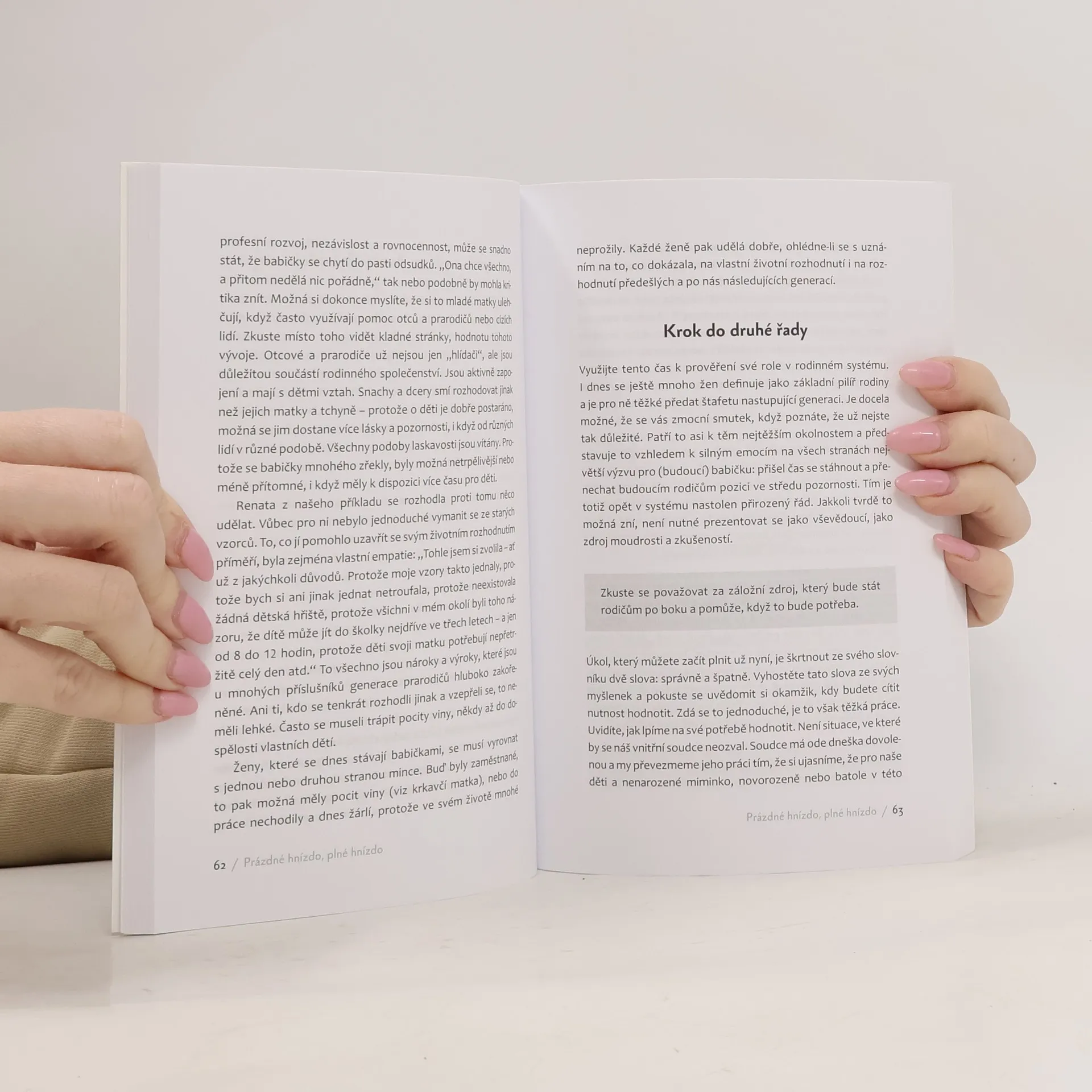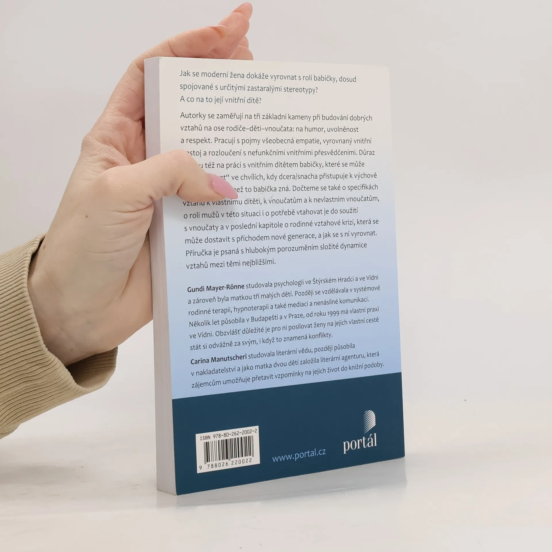 Jak se moderní žena dokáže vyrovnat s rolí babičky, dosud spojované s určitými zastaralými stereotypy? A co na to její vnitřní dítě? Autorky, samy svižné, mladistvé ženy, které zažité představě rozhodně neodpovídají, se zaměřují na tři základní kameny při budování dobrých vztahů na ose rodiče–děti–vnoučata: na humor, uvolněnost a respekt. Pracují s pojmy všeobecná empatie, vyrovnaný vnitřní postoj a rozloučení s nefunkčními vnitřními přesvědčeními. Důraz kladou též na práci s vnitřním dítětem babičky, které se může často „ozývat“ ve chvílích, kdy dcera/snacha přistupuje k výchově vnoučete jinak, než to babička zná. Zabývají se i vymezením hranic – o tom, nakolik role babičky ovlivní ženin život, a o potřebě spontánnosti v nečekaných situacích. Dále se dočteme o specifikách vztahu k vlastnímu dítěti, k vnoučatům a k nevlastním vnoučatům, o roli mužů v této situaci a o potřebě je vtahovat do soužití s vnoučaty a v poslední kapitole o rodinné vztahové krizi, která se může dostavit s příchodem nové generace, a jak se s ní vyrovnat. Příručka je psaná s hlubokým porozuměním složité dynamice vztahů mezi nejbližšími osobami