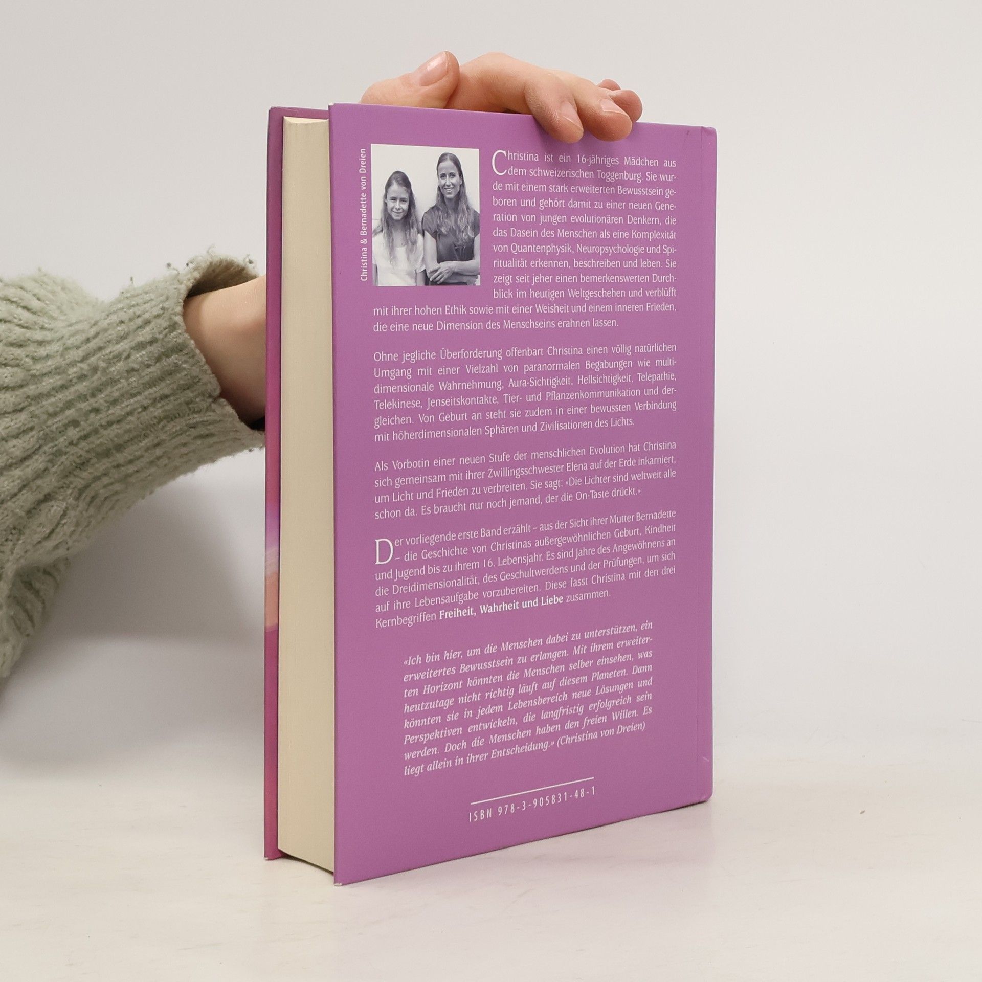 Christina ist ein 16-jähriges Mädchen aus dem Toggenburg, das mit einem stark erweiterten Bewusstsein geboren wurde. Sie gehört zu einer neuen Generation von jungen Denkern, die das menschliche Dasein als eine Komplexität aus Quantenphysik, Neuropsychologie und Spiritualität erkennen. Christina beeindruckt mit ihrer hohen Ethik, Weisheit und einem inneren Frieden, der eine neue Dimension des Menschseins erahnen lässt. Sie zeigt einen natürlichen Umgang mit paranormalen Fähigkeiten wie multidimensionaler Wahrnehmung, Aura-Sichtigkeit, Hellsichtigkeit, Telepathie und Tierkommunikation. Von Geburt an ist sie in bewusster Verbindung mit höheren Dimensionen und Zivilisationen des Lichts. Gemeinsam mit ihrer Zwillingsschwester Elena ist sie auf der Erde inkarniert, um Licht und Frieden zu verbreiten. Band 1 erzählt aus der Sicht ihrer Mutter Bernadette von Christinas außergewöhnlicher Geburt, Kindheit und Jugend bis zu ihrem 16. Lebensjahr. Diese Jahre sind geprägt von der Anpassung an die Dreidimensionalität und der Vorbereitung auf ihre Lebensaufgabe, die sie mit den Begriffen Freiheit, Wahrheit und Liebe zusammenfasst. Christina möchte den Menschen helfen, ein erweitertes Bewusstsein zu erlangen, um neue Lösungen für die Herausforderungen der Welt zu finden. Doch letztlich liegt die Entscheidung im freien Willen der Menschen.