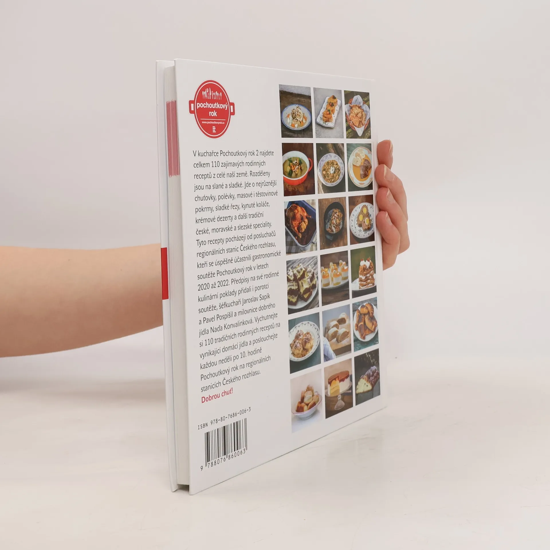 101 tradičních rodinných receptů na vynikající domácí jídla.V kuchařce Pochoutkový rok 2 najdete celkem 110 zajímavých rodinných receptů z celé naší země. Rozděleny jsou na slané a sladké. Jde o nejrůznější chuťovky, polévky, masové i těstovinové pokrmy, sladké řezy, kynuté koláče, krémové dezerty a další tradiční české, moravské a slezské speciality. Tyto recepty pocházejí od posluchačů regionálních stanic Českého rozhlasu, kteří se úspěšně účastnili gastronomické soutěže Pochoutkový rok v letech 2020 až 2022. Předpisy na své rodinné kulinární poklady přidali i porotci soutěže, šéfkuchaři Jaroslav Sapík a Pavel Pospíšil a milovnice dobrého jídla herečka Naďa Konvalinková. Vychutnejte si 110 tradičních rodinných receptů na vynikající domácí jídla a poslouchejte každou neděli po 10. hodině Pochoutkový rok na regionálních stanicích Českého rozhlasu. Dobrou chuť!