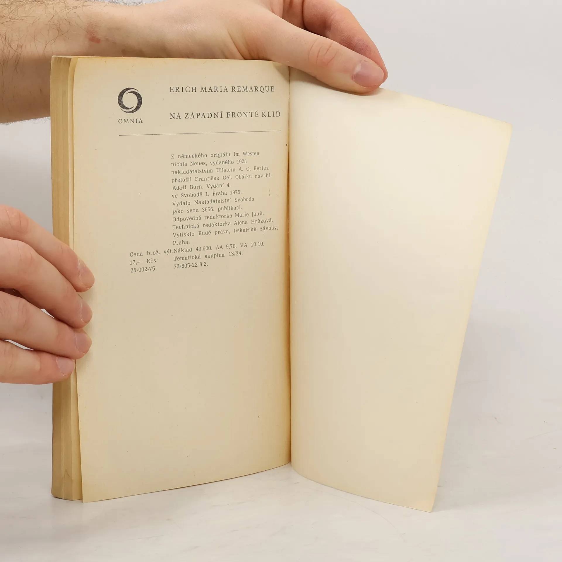 Nejslavnější autorův román z prostředí první světové války vypráví o generaci chlapců, kteří v roce 1914 rovnou ze školních lavic, s vlajícími prapory, nadšením a vojenskou hudbou, táhli na frontu, odkud se vrátili zničeni na duchu i na těle, přestože unikli smrtícím granátům. Mladí lidé, vychovaní svými učiteli k tomu, že umírání na bojišti je svatou povinností a otázkou cti, poznali skutečnou tvář nesmyslné války, a pokud se z ní někteří vrátili, nedokázali zakotvit v novém životě, nechápali ho - příliš děsivé byly zážitky ze zákopů, příliš živé vzpomínky na padlé kamarády. Román je krutou obžalobou a pravdivým obrazem tragédie války, která nezabíjí jednotlivce, ale mrzačí celé generace - nejstrašnější totiž není výbuch granátu, ale zasažené lidské srdce…