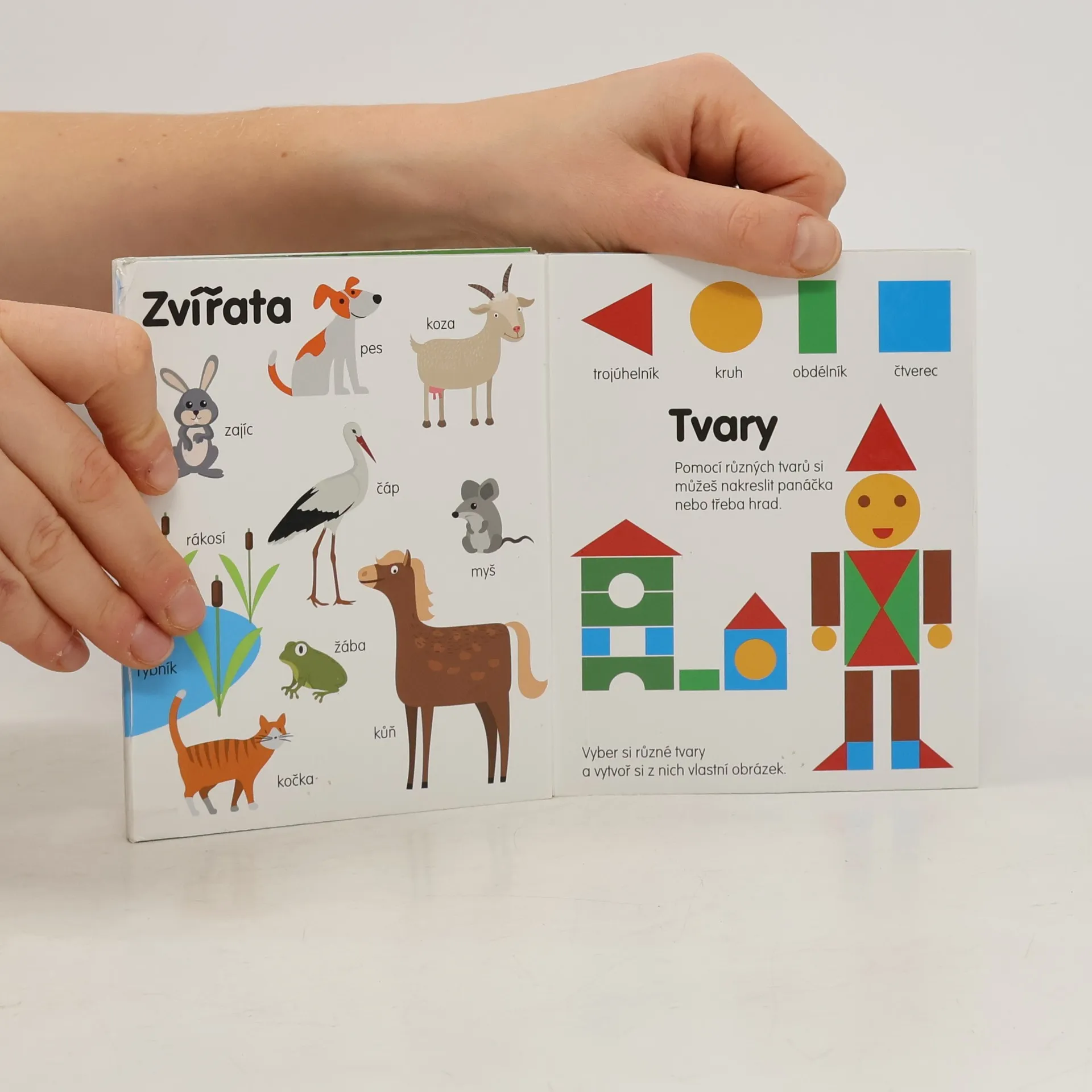 Pojďte s dětmi prozkoumat různé tvary, barvy, zvířata, počítání a předměty kolem sebe. Milé ilustrace a jednoduché popisky zajistí přehledné učení a mnoho podnětů k hovoru, rozvíjení přirozené dětské zvědavosti a chuť objevovat svět kolem nich. Toto leporelo ve formátu harmoniky z pevného a odolného papíru zajistí mnoho hodin zábavy a zaručí, že knížka přežije i méně šetrné zacházení nejmenších dětí a poslouží i k procvičování jemné motoriky.