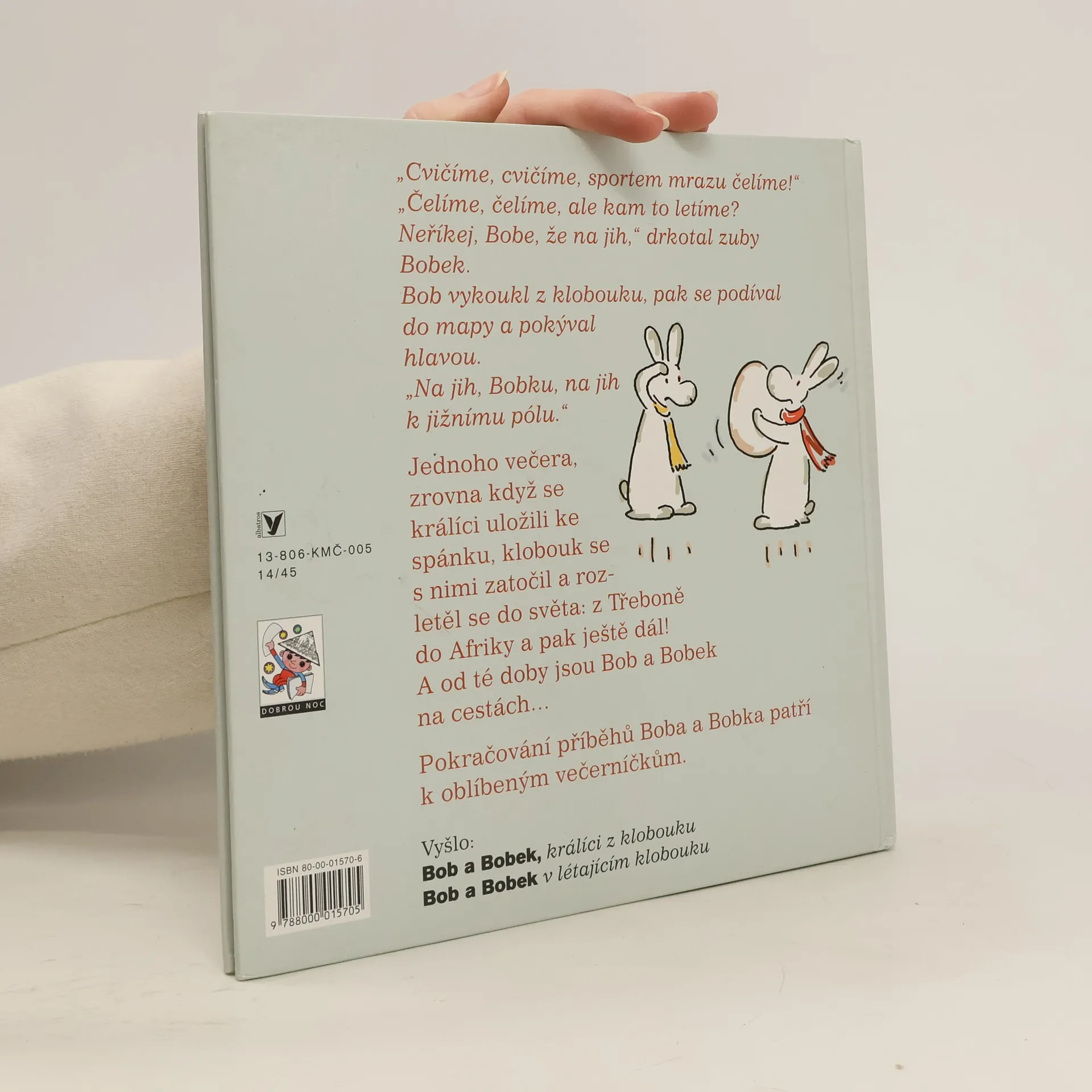 Jednoho večera, zrovna když se králíci Bob a Bobek uložili ke spánku, jejich klobouk se i s nimi zatočil a rozletěl se do světa: z Třeboně do Afriky a pak ještě dál! A od té doby jsou Bob a Bobekna cestách... Pokračování příběhů Boba a Bobka patří k oblíbeným večerníčkům.