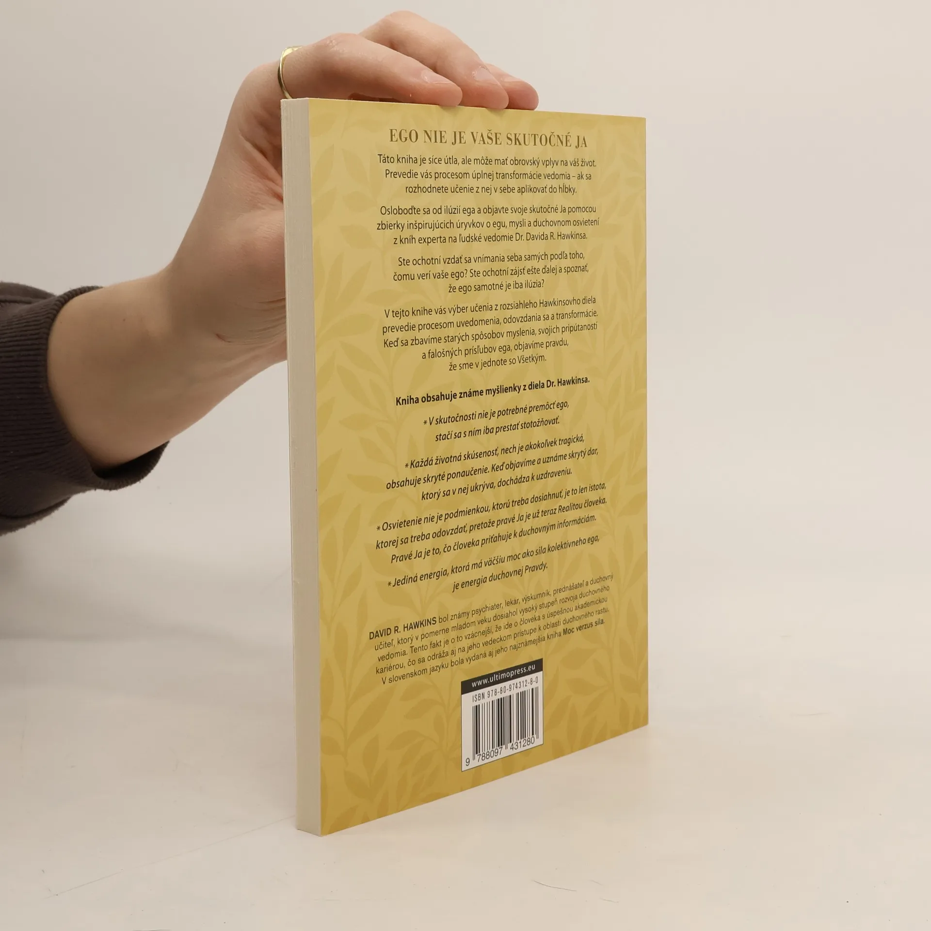Táto kniha je síce útla, ale môže mať obrovský vplyv na váš život. Prevedie vás procesom úplnej transformácie vedomia – ak sa rozhodnete učenie z nej v sebe aplikovať do hĺbky. Pomôže vám oslobodiť sa od ilúzií ega a objaviť svoje skutočné Ja pomocou zbierky inšpirujúcich úryvkov o egu, mysli a duchovnom osvietení z kníh experta na ľudské vedomie, Dr. Davida R. Hawkinsa.Ste ochotní vzdať sa vnímania seba samých podľa toho, čomu verí vaše ego? Ste ochotní zájsť ešte ďalej a spoznať, že ego samotné je iba ilúzia? V tejto knihe vás výber učenia z rozsiahleho Hawkinsovho diela prevedie procesom uvedomenia, odovzdania sa a transformácie. Keď sa zbavíme starých spôsobov myslenia, svojich pripútaností a falošných prísľubov ega, objavíme pravdu, že sme v jednote so Všetkým.