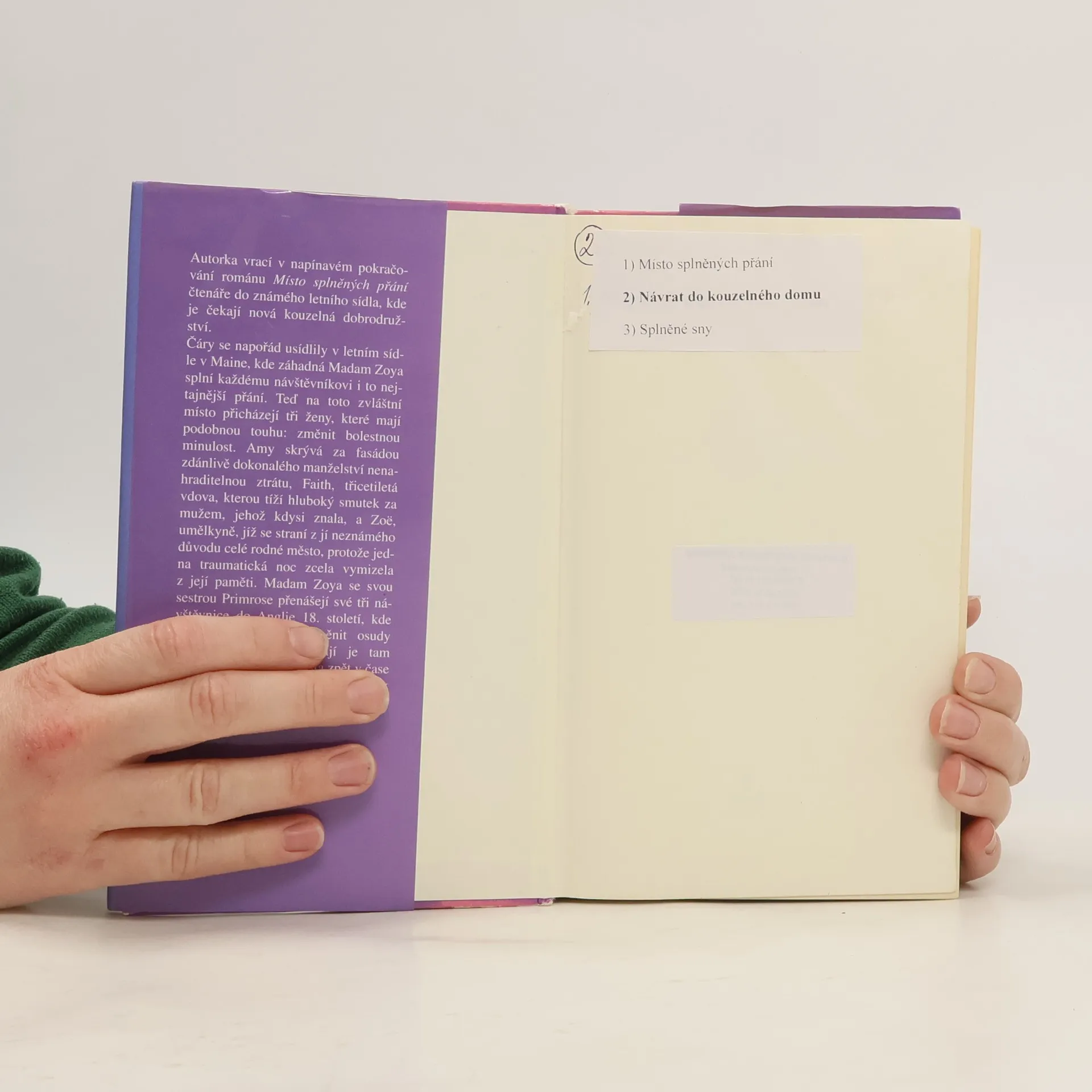 V napínavém pokračování Místa splněných přání autorka vrací čtenáře do známého letního sídla, kde je čekají nová kouzelná dobrodružství. Čáry se napořád usídlily v letním sídle v Maine, kde záhadná Madam Zoya splní každému návštěvníkovi i to nejtajnější přání. Teď na toto zvláštní místo přicházejí tři ženy, které mají podobné přání: změnit bolestnou minulost. Madam Zoya je přenáší do Anglie 18. století, kde mají změnit osudy předků. Tam je čekají mnohá překvapení a cesta zpět v čase nemusí skončit tak šťastně.