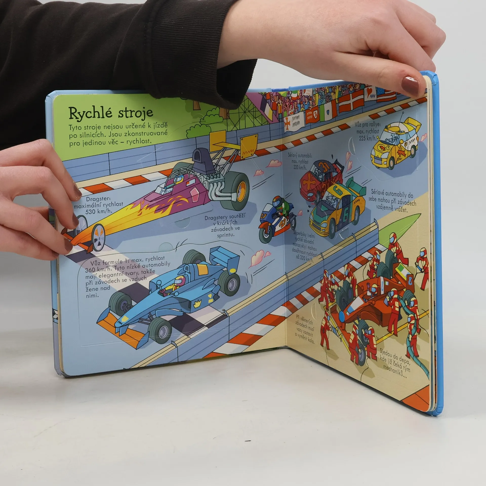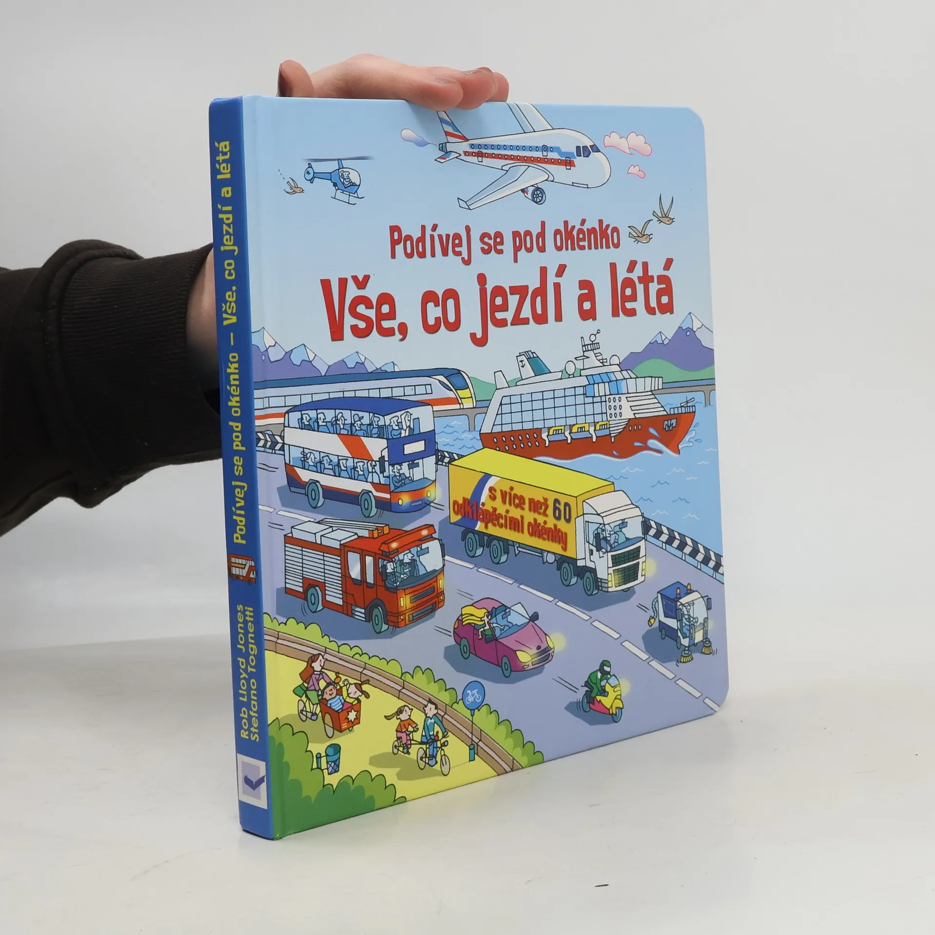 Seznam se díky této encyklopedické knížce, mající více než 60 odklápěcích okének, s různými dopravními prostředky – s vlaky, uhánějícími po železničních tratích, s nákladními automobily, převážejícími různé náklady, s velkými proudovými dopravními letadly, přepravujícími cestující po celém světě, s farmářskými stroji, supícími na polích, ale také se závodními auty, obrovskými výletními loděmi, pohotovostními vozidly, která spěchají pomoci lidem v nouzi, i se stavebními stroji, které používají stavbaři na nerovném terénu stavenišť. Tak honem nastupovat, jedeme!