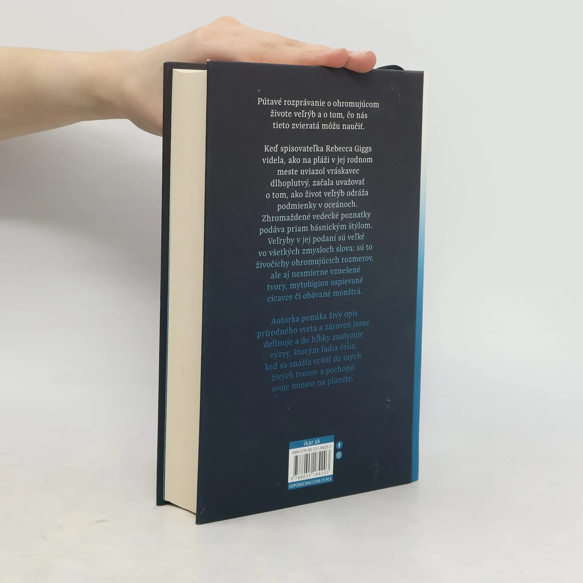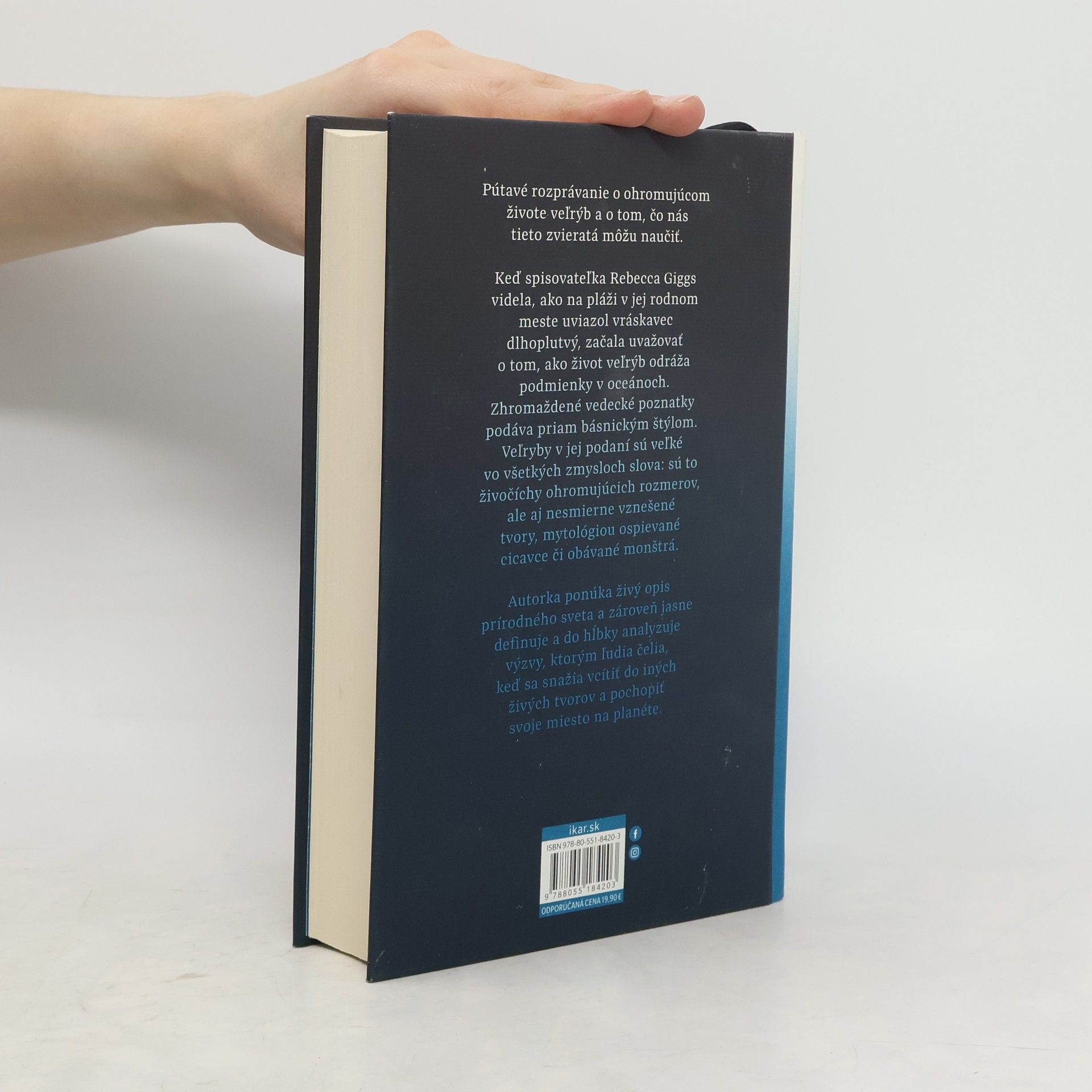 Pútavé rozprávanie o ohromujúcom živote veľrýb a o tom, čo nás tieto zvieratá môžu naučiťKeď spisovateľka Rebecca Giggs videla, ako na pláži v jej rodnom meste uviazol vráskavec dlhoplutvý, začala uvažovať o tom, ako život veľrýb odráža podmienky v oceánoch. Zhromaždené vedecké poznatky podáva priam básnickým štýlom. Veľryby v jej podaní sú veľké vo všetkých zmysloch slova: sú to živočíchy ohromujúcich rozmerov, ale aj nesmierne vznešené tvory, mytológiou ospievané cicavce či obávané monštrá.Kniha spája prírodovedu, filozofiu a ďalšie vedné disciplíny a snaží sa nájsť odpovede na otázky: Ako veľryby vnímajú ekologickú zmenu? Ako ľudské technológie prenikli do kultúry veľrýb a ako ju zmenili? Čo nás môže pozorovanie veľrýb naučiť o zložitom, krehkom a nádhernom živote?Dozviete sa o veľrybách, ktoré sú také zriedkavé, že im vedci ani nedali meno, o veľrybích piesňach, ktoré sa šíria po celom svete v pravidelných vlnách ako popové skladby, či o veľrybách, ktoré zmenili chemické zloženie atmosféry okolo našej planéty. Vyberiete sa do Japonska na palubu lode, ktorá loví veľryby, a ponoríte sa do najhlbších morí, aby ste zistili, ako sa plastové znečistenie šíri v podmorskom prostredí.Autorka ponúka živý opis prírodného sveta a zároveň jasne definuje a do hĺbky analyzuje výzvy, ktorým ľudia čelia, keď sa snažia vcítiť do iných živých tvorov a pochopiť svoje miesto na planéte.