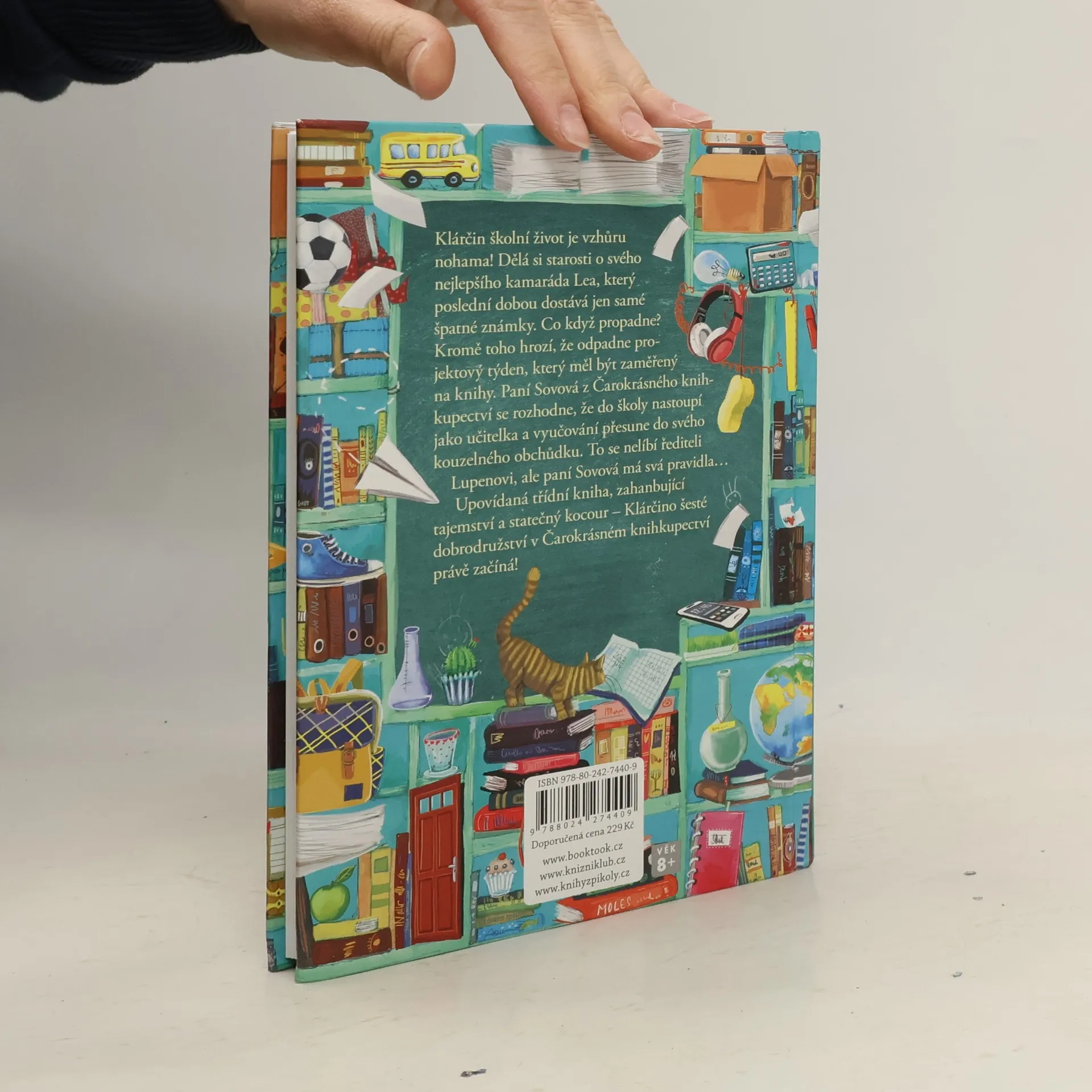 Klárčin školní život je vzhůru nohama! Dělá si starosti o svého nejlepšího kamaráda Lea, který poslední dobou dostává jen samé špatné známky. Co když propadne? Kromě toho hrozí, že odpadne projektový týden, který měl být zaměřený na knihy. Paní Sovová z Čarokrásného knihkupectví se rozhodne, že do školy nastoupí jako učitelka, a vyučování přesune do svého kouzelného obchůdku vonícího čokoládovými dortíky. To se nelíbí přísnému řediteli Lupenovi, ale paní Sovová má svá pravidla…Upovídaná třídní kniha, zahanbující tajemství a statečný kocour – Klárčino šesté dobrodružství v Čarokrásném knihkupectví právě začíná. Kniha je určena dětem od 8 let.
