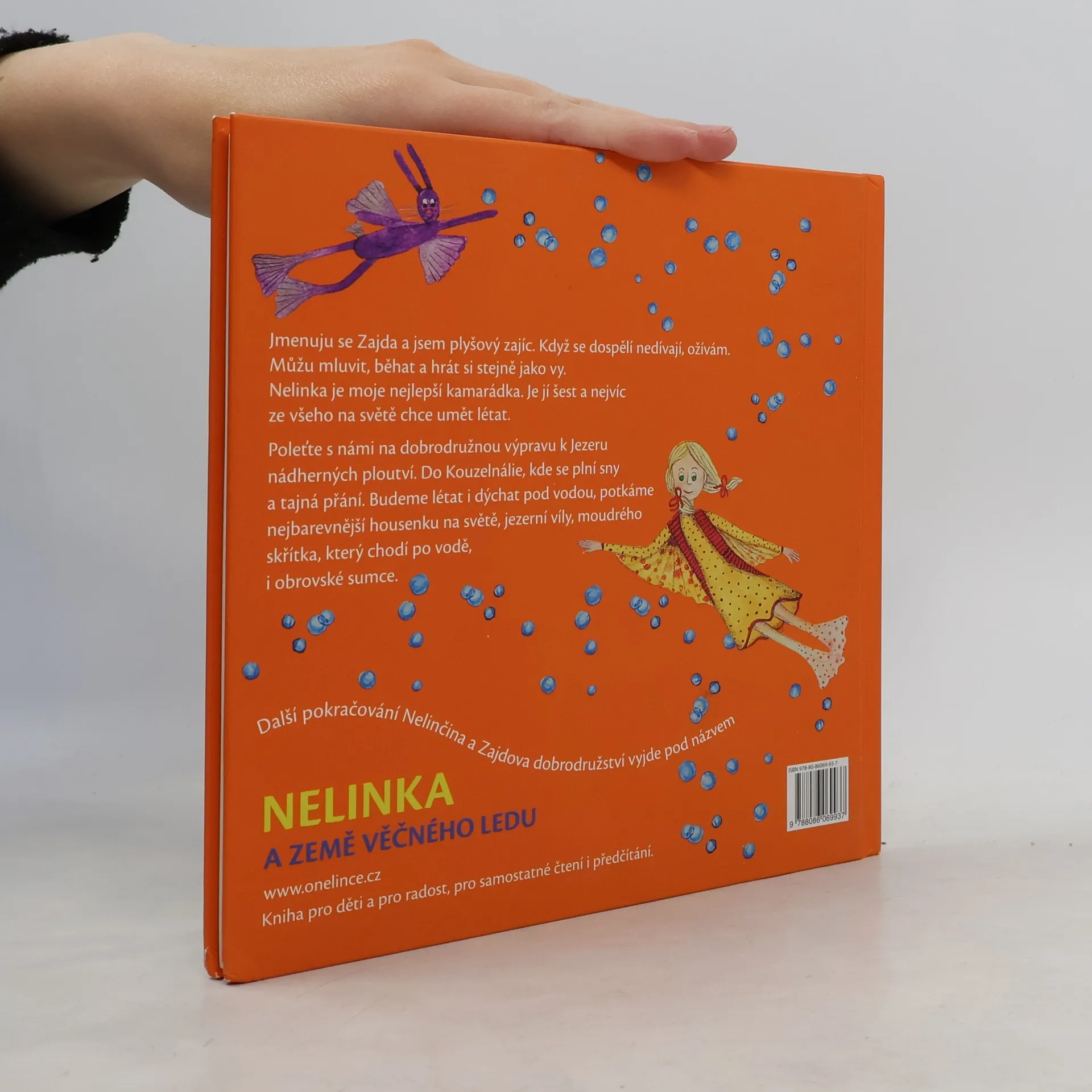 Kniha pro děti a pro radost. Dobrodružství šestileté Nelinky a jejího plyšového zajíce Zajdy, který ožívá, když se dospělí nedívají, vás zavede do kouzelné země, kde je možné úplně vše. Hlavní hrdinové budou nejen létat, ale také dýchat pod vodou a poznávat jezerní svět. Potkají nejbarevnější housenku na světě, jezerní víly, moudrého skřítka, který chodí po vodě, i obrovské sumce. Jako dárek je vložena rybí záložka.