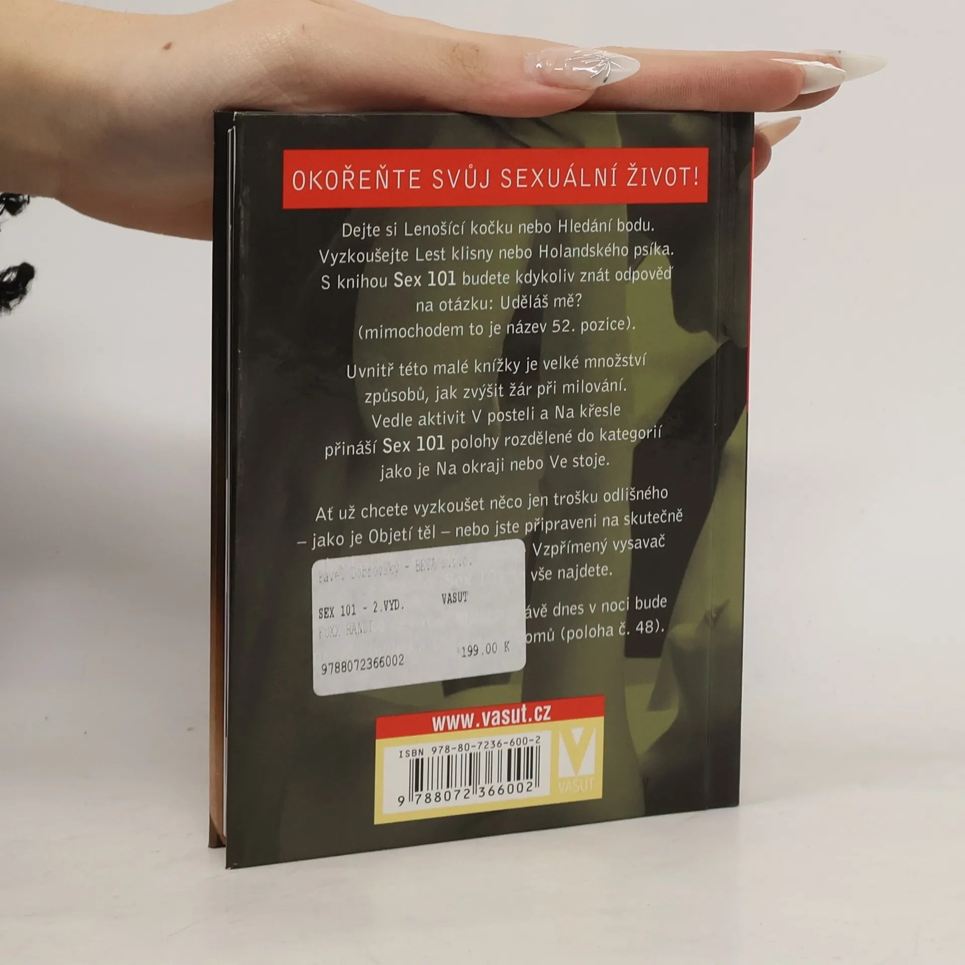 Okořeňte svůj sexuální život! Dejte si Lenošící kočku nebo Hledání bodu. Vyzkoušejte Lest klisny nebo Holandského psíka. S knihou Sex 101 budete kdykoliv znát odpověď na otázku: Uděláš mě? (mimochodem to je název 52. pozice). Uvnitř této malé knížky je velké množství způsobů, jak zvýšit žár při milování. Vedle aktivit V posteli a Na křesle přináší Sex 101 polohy rozdělené do kategorií jako je Na okraji nebo Ve stoje. Ať už chcete vyzkoušet něco jen trošku odlišného - jako je Objetí těl - nebo jste připraveni na skutečně akrobatické polohy - jako je Vzpřímený vysavač - v knize Sex 101 to vše najdete. Tak na co čekáte? Možná právě dnes v noci bude pravá chvíle ke Vklouznutí domů (poloha č. 48).