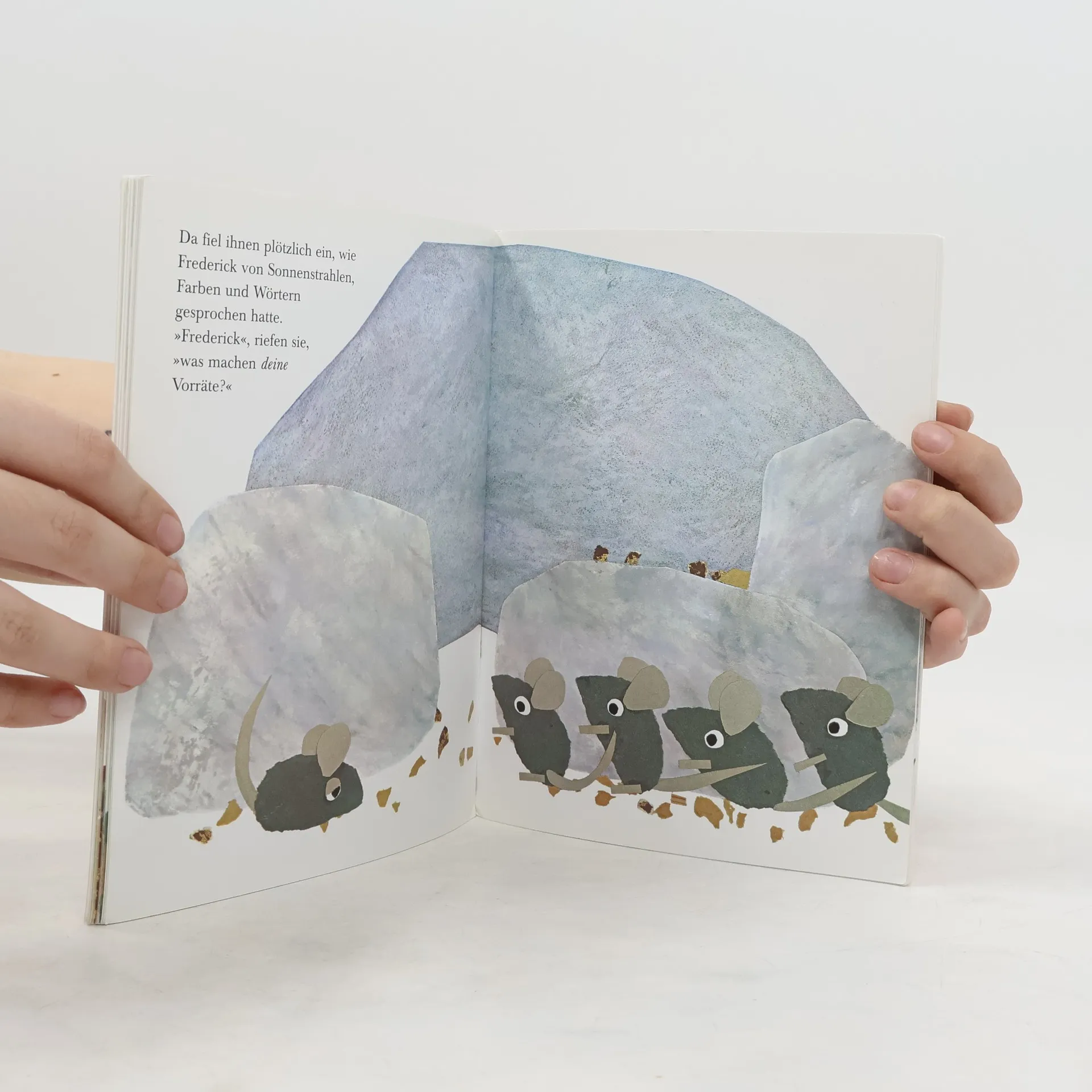 „Macht die Augen zu“, sagte Frederick und kletterte auf einen großen Stein. „Jetzt schicke ich euch die Sonnenstrahlen. Fühlt ihr schon, wie warm sie sind? Schön warm und golden.“
