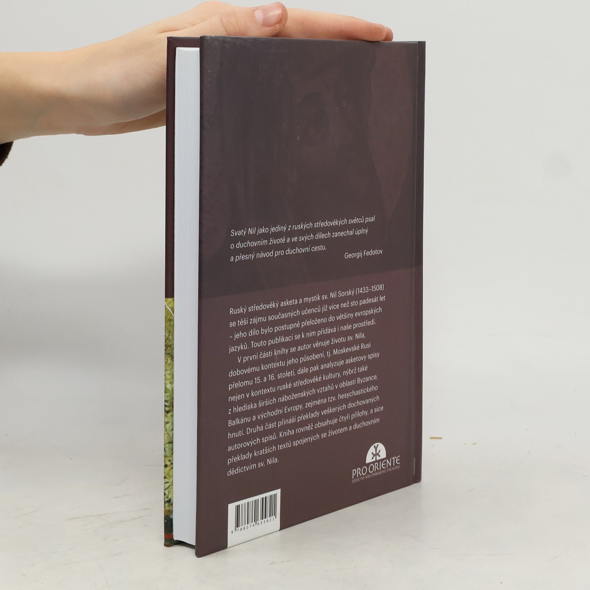 Ruský středověký asketa a mystik sv. Nil Sorský (1433–1508) se těší zájmu současných učenců již více než sto let – jeho dílo (či fragmenty z něj) byly přeloženy do většiny evropských jazyků. Touto publikací se k nim přidává i naše prostředí.V první části knihy se autor věnuje životu sv. Nila, dobovému kontextu jeho působení (Moskevská Rus přelomu 15. a 16. století), dále pak analyzuje asketovy spisy nejen v kontextu ruské středověké kultury, nýbrž také z hlediska širších náboženských vztahů v oblasti Byzance, Balkánu a východní Evropy, zejména pak druhé vlny tzv. hesychastického hnutí.Druhá část přináší překlady (z církevní slovanštiny ruské redakce do češtiny) veškerých dochovaných autorových spisů („Pravidla duchovního života“, „Pravidla mnišského života“, listy, modlitby, předmluvy ke „Sborníkům“, „Závěť“). Kniha rovněž obsahuje čtyři přílohy, a sice překlady kratších textů spojených se životem a duchovním dědictvím sv. Nila: „Vyprávění o skitu Nila Sorského“, „Závěť Innokentije Komelského“, „Jak se svatý Nil Sorský zjevil ve snu velikému knížeti Ivanu Hroznému, poznámka o jeho životě a modlitba“ a „O zázracích otce našeho svatého Nila Divotvůrce“.