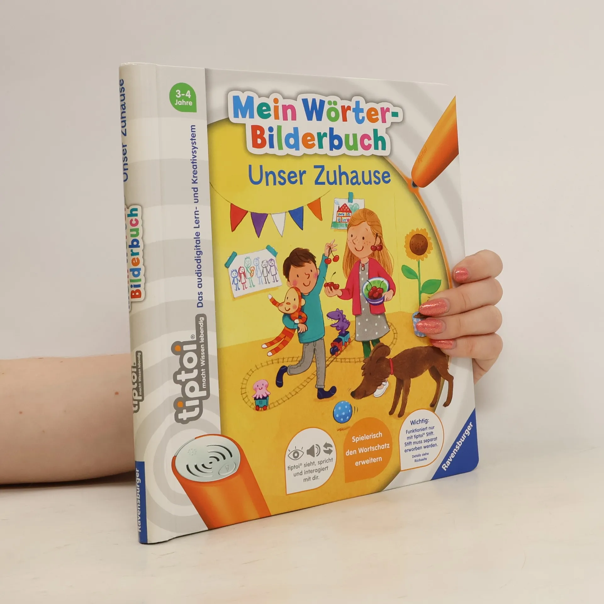 Wörterlernen leicht gemacht: spielerischer Spracherwerb! Willkommen bei uns Zuhause! Hier wohnen Schulkind Lara, Kindergartenkind David und Baby Finn gemeinsam mit ihren Eltern, Großeltern und Hund Rocky. Mit tiptoi erwacht das Zuhause der Hoffmanns zum Leben. Was gibt es in der Küche zu entdecken? Welche Farben hat das Spielzeug? Was macht man vor dem Zubettgehen? Kinder erweitern spielerisch ihren Wortschatz und verinnerlichen erste grammatische Strukturen. Spiele und Lieder vertiefen den gelernten Wortschatz. Mit der Reihe tiptoi Mein Wörter-Bilderbuch bauen Kinder spielerisch ihren Wortschatz auf und erweitern diesen selbstständig. Die kurzen, leicht verständlichen Texte eignen sich ideal für Kinder ab 3 Jahren. Jedes Buch zeigt den Kindern bekannte Szenen und Situationen und vermittelt viele vertraute Begriffe aus dem direkten Umfeld und der Erfahrungswelt der Kinder. Überall gibt es spannende Sätze, zahlreiche Dialoge und lustige Geräusche zu entdecken. Dabei sind die einzelnen Begriffe in ganze Sätze eingebunden, um den Kindern erste grammatische Strukturen zu vermitteln. In jedem Buch wird das Gelernte durch kindgerechte und abwechslungsreiche Spiele mit Lösungskontrolle abgefragt und vertieft. Neukomponierte Lieder und liebevolle Geschichten motivieren zum spielerischen Wörterlernen. tiptoi-Stift nicht enthalten. Muss separat erworben werden.