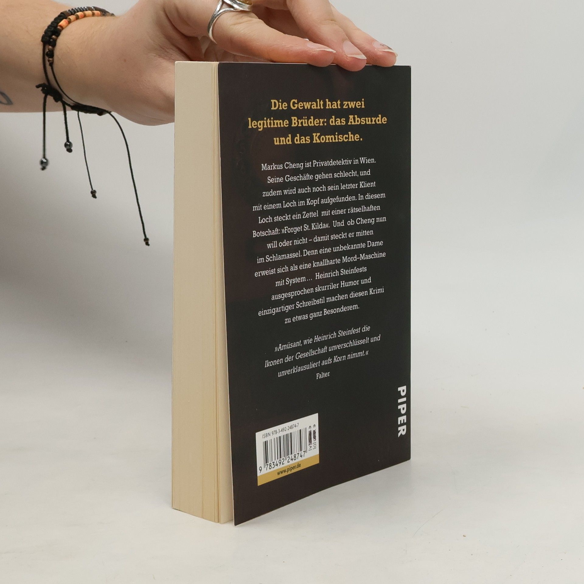 Markus Cheng ist Privatdetektiv in Wien. Seine Geschäfte gehen schlecht, und zudem wird auch noch sein letzter Klient mit einem Loch im Kopf aufgefunden. In diesem Loch steckt ein Zettel mit einer rätselhaften Botschaft: »Forget St. Kilda«. Und ob Cheng nun will oder nicht – damit steckt er mitten im Schlamassel. Denn eine unbekannte Dame erweist sich als eine knallharte Mordmaschine mit System … Heinrich Steinfests ausgesprochen skurriler Humor und einzigartiger Schreibstil machen diesen Krimi zu etwas ganz Besonderem.